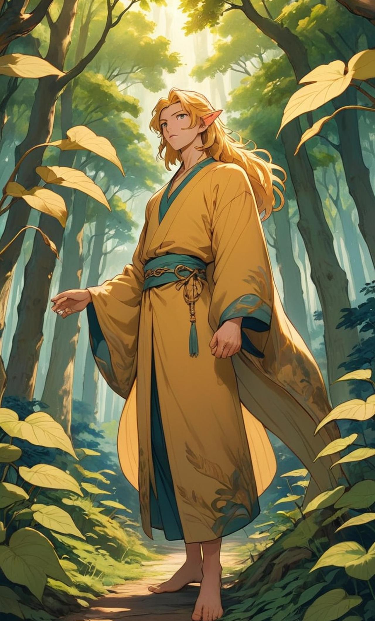 萨鲁有金色的长发,尖尖的耳朵,性格温和。他衣着华贵,身材修长,身上缠着藤蔓。他站在森林里,身边巨树枝繁叶茂,遮天蔽日。