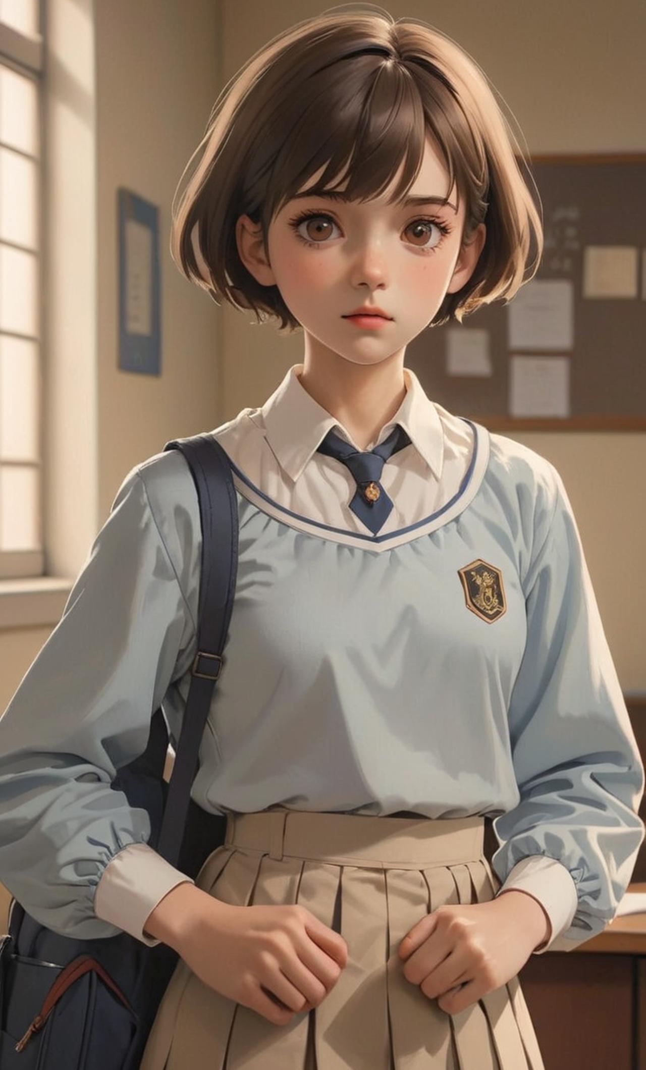 Young girl of twelve years old. Short hair, brown eyes, slim build. She's curious and courageous but also frightened and confused. Her clothing consists of school uniform.