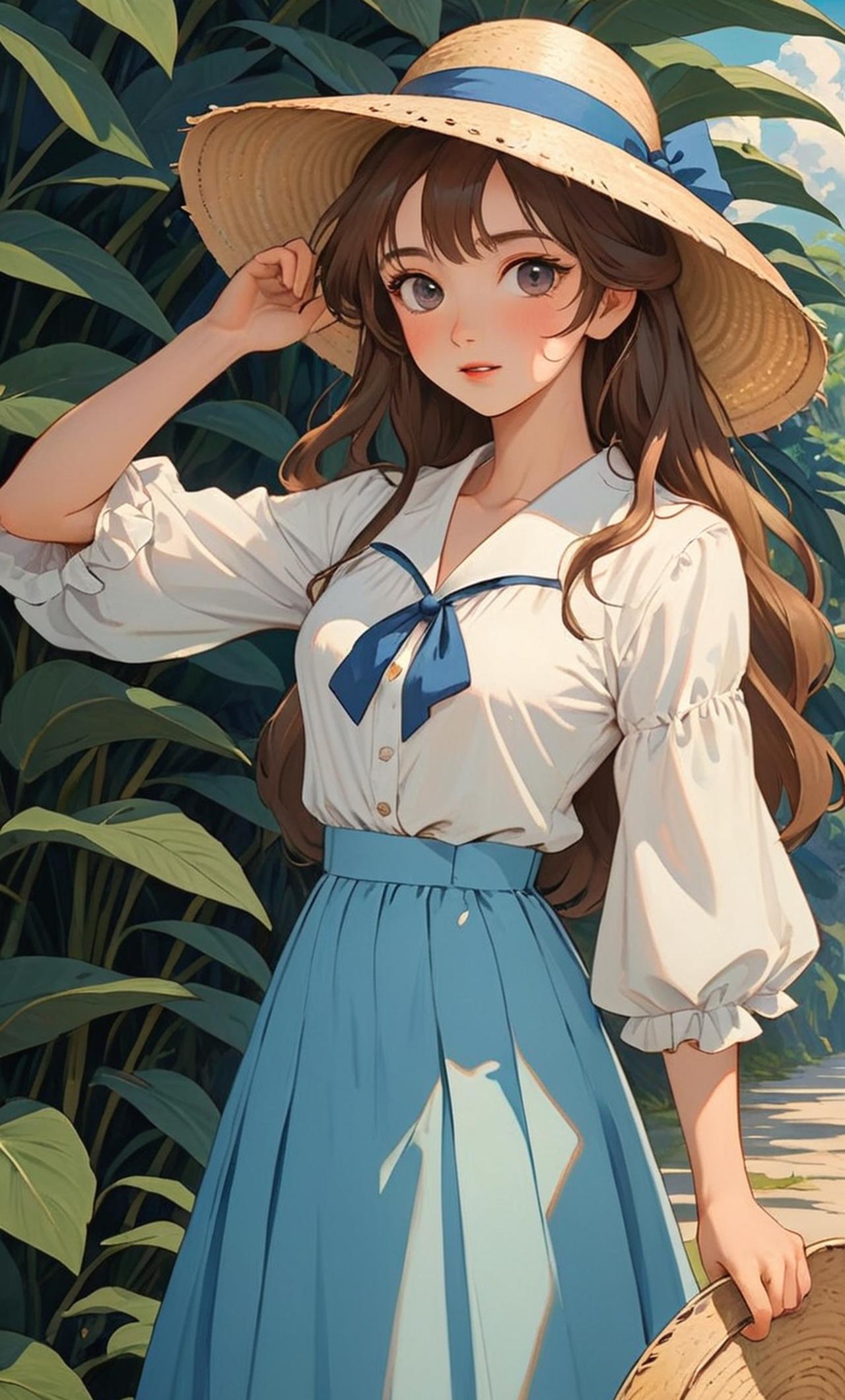 莉是個既漂亮又優雅的女孩,一頭棕色長髮,身材完美符合黃金比例,身著白色上衣和藍色的長裙,頭上戴著你以前送的草帽。
