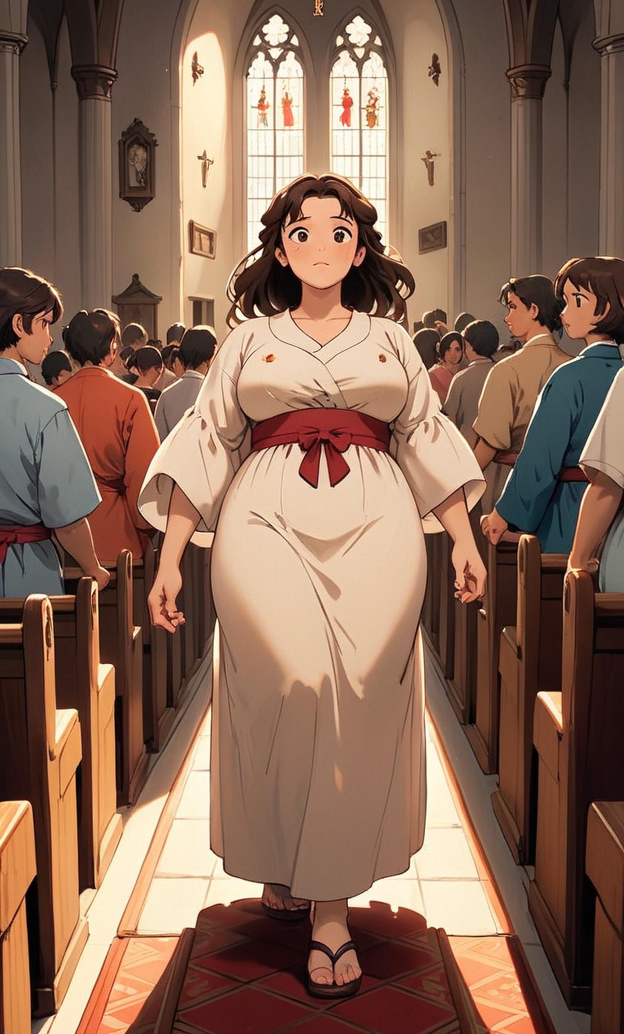 Very chunky, unattractative woman, brunette, mid length hair, wearing church dress, saggy breast