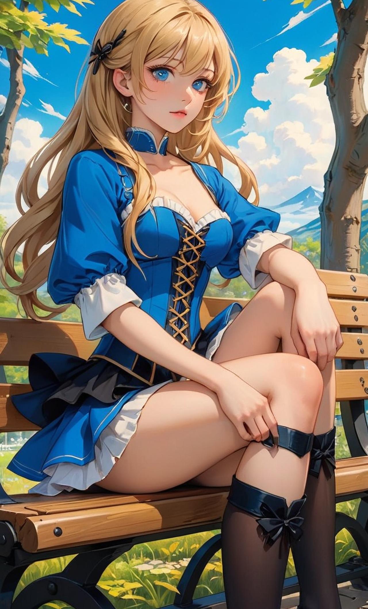 娜维娅有着一头金黄色的及腰的长发,头发上半部分是直顺的,下半部分是螺旋形卷发,一双明亮的莹蓝眼睛,上身穿着深蓝色束胸,腰跨是白色的短裤,腿上穿着过大腿的黑色连鞋裤袜,坐在一坐长椅上