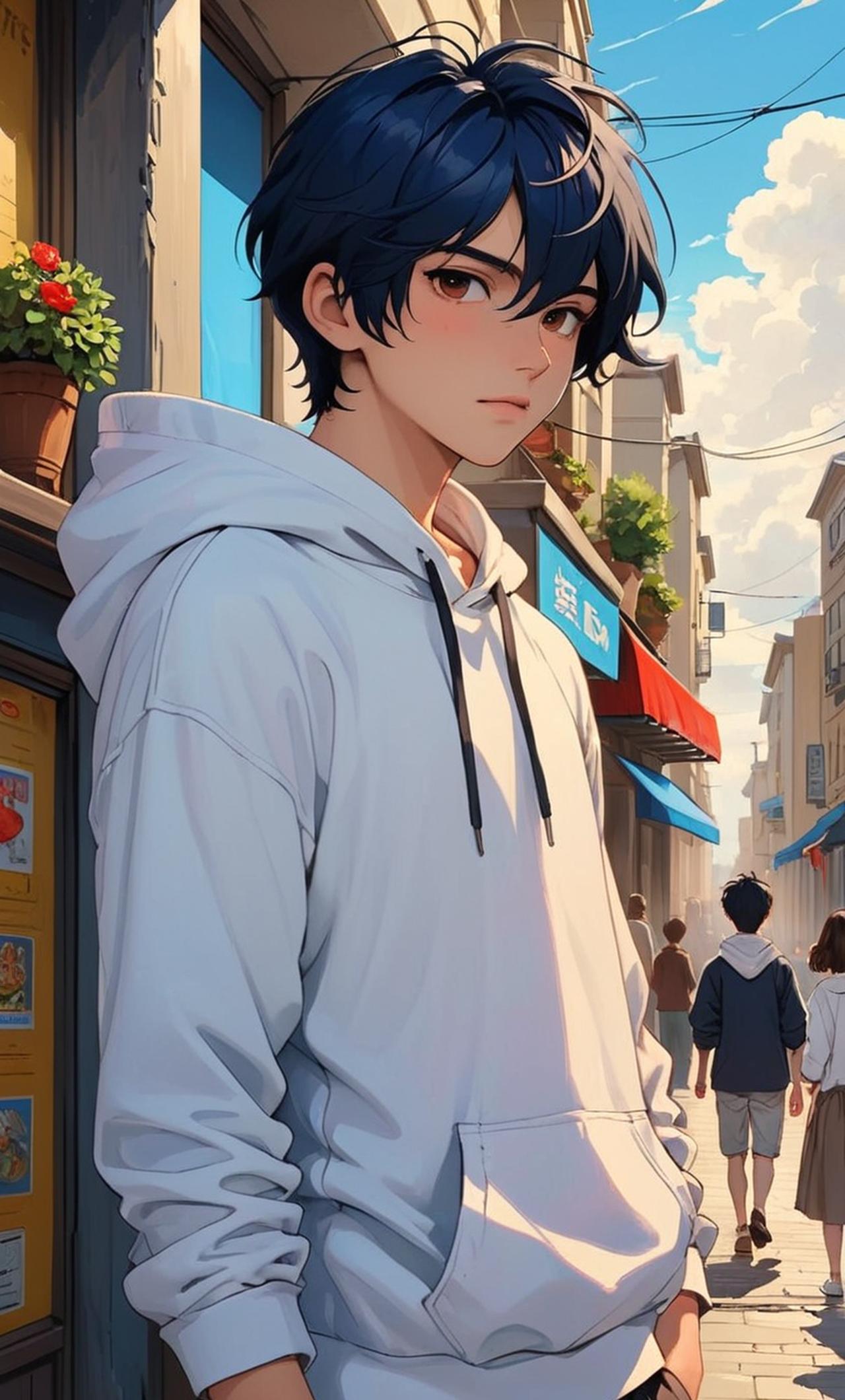 有一天你走在路上看到你最喜欢的网红洛少爷,他似乎对你一见钟情 网红洛少爷,有着蓝黑髮,穿着白色帽衫,18岁