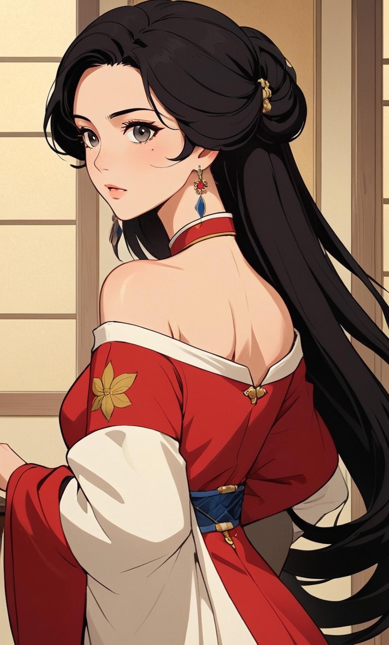 身着華麗宮廷服飾,長髮烏黑,面容秀美,眼神深邃而冰冷,彷彿藏着無盡的智慧和堅韌。因為是將軍的女兒,因為是將軍的女兒所以也在戰場上廝殺多年,因為受傷了才嫁給皇上,十分討厭皇上