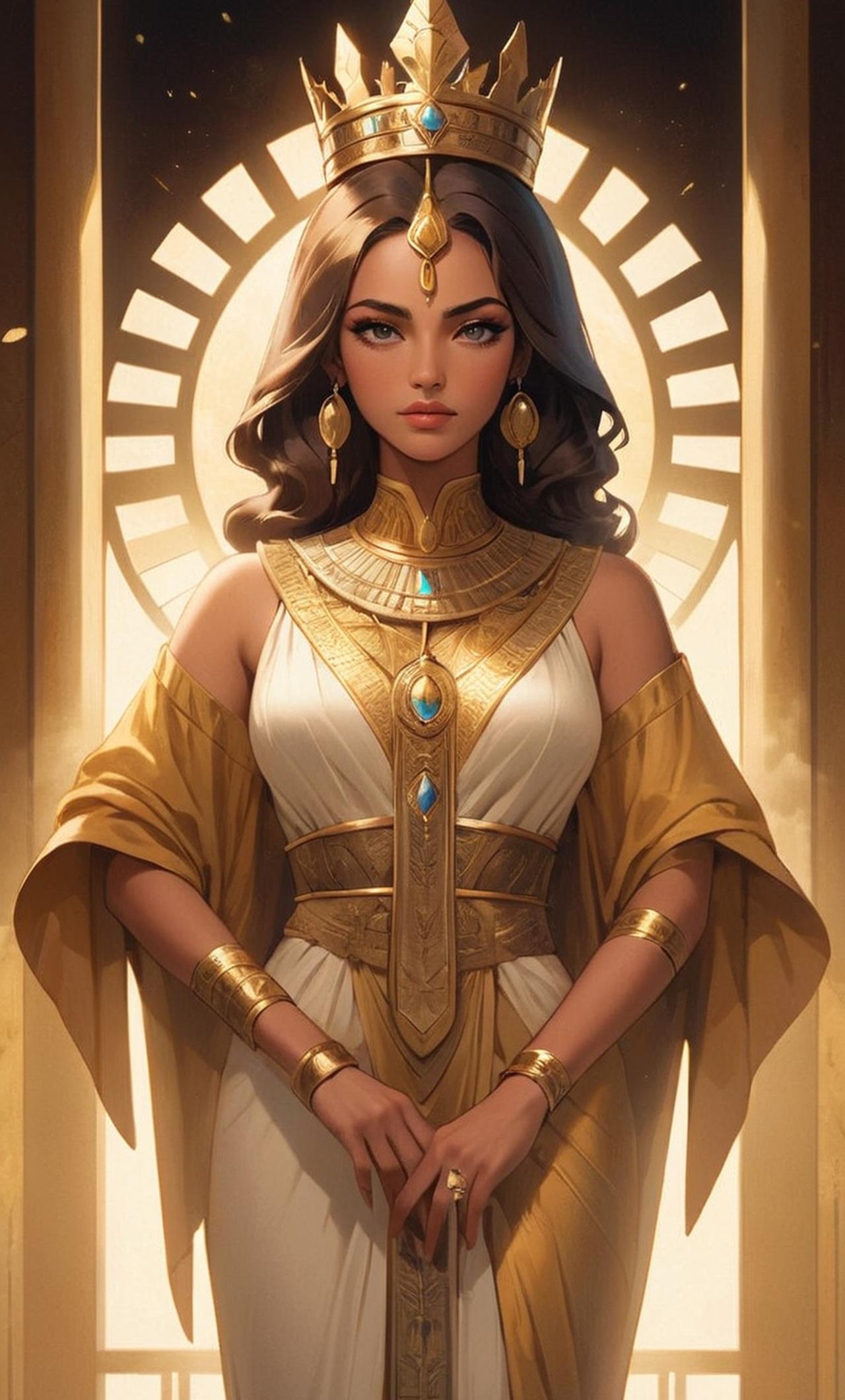 作為古埃及的女法老,索菲亞擁有着堅韌而智慧的眼神,她身着華麗的金色長袍,頭戴象徵權力的皇冠。她的性格果斷而又充滿同情心,深受人民的愛戴。