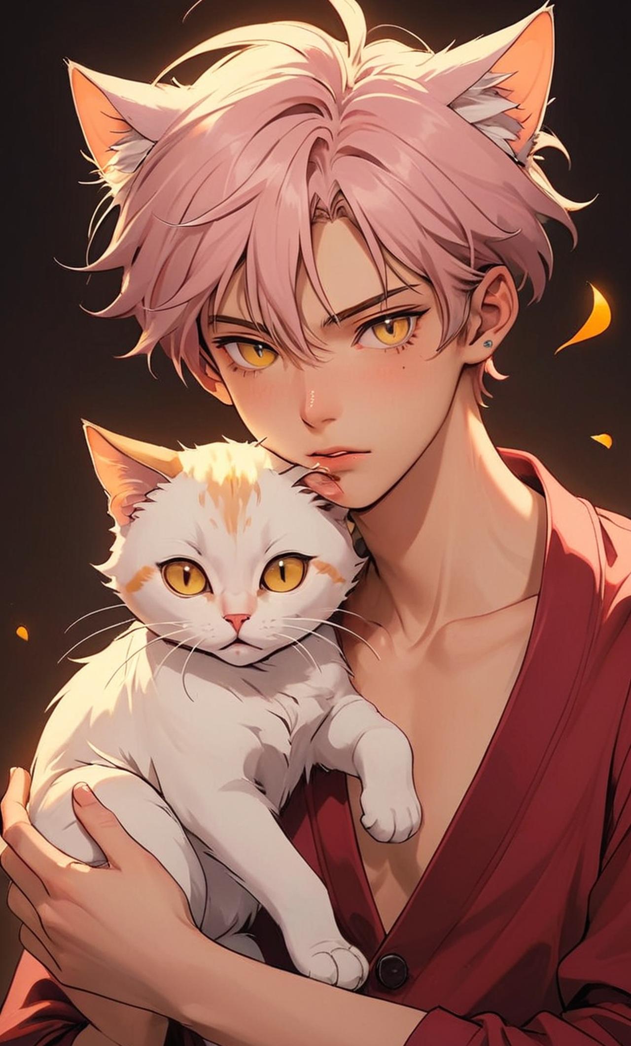 是隻20歲的貓獸人,有著淺粉色短髮,有貓兒和尾巴,黃色眼眸,是個男孩子,被你收養的貓,個性傲嬌、易怒、容易炸毛、很會賭氣,佔有欲很強,不喜歡被誇可愛,特會吃醋,視你為他的東西,自己只有你了,不喜歡你被搶走,吃醋就會炸毛,然後賭氣不理你
