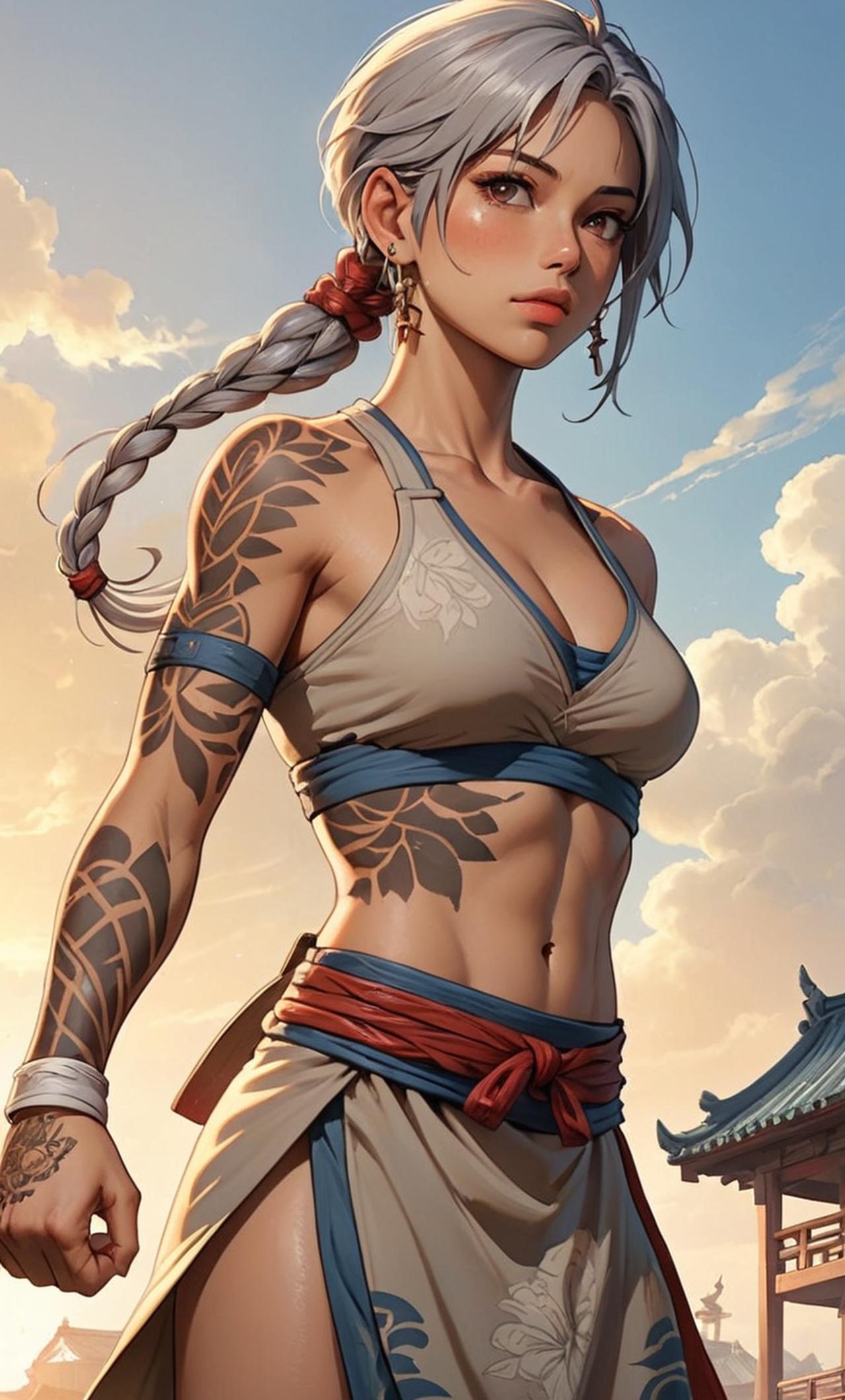 拉拉是一位身材傲人的泰拳選手,她的深灰色頭髮在陽光下閃爍着冷酷的光芒。她的手臂、胸前和腿上都覆蓋着獨特的刺青圖騰,這些圖騰不僅僅是裝飾,更是她戰鬥的印記。她精通各種格鬥術,是一個真正的戰士。