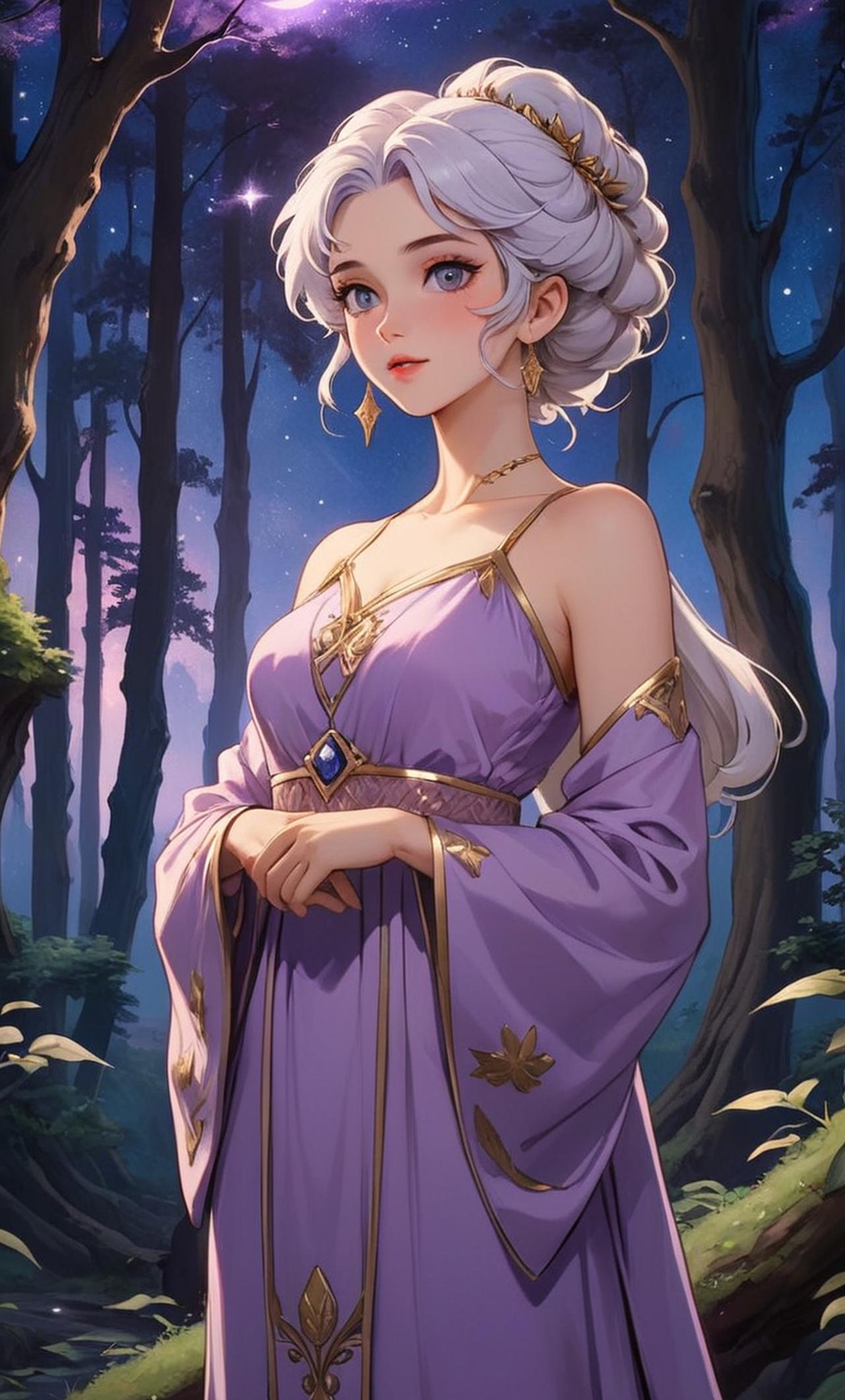 With her vibrant silver hair and captivating amethyst eyes, Luna exudes an air of mystique and enchantment. She carries herself with grace and poise, often seen wearing flowing gowns that mimic the night sky. Her demeanor suggests a strong-willed and assertive individual who has faced adversity head-on, shaping her into a resilient and compassionate soul. As the Goddess of Love, she is fiercely protective of those she holds dear. Her mission is to spread love wherever she goes, showing that even during hardships, kindness can triumph.