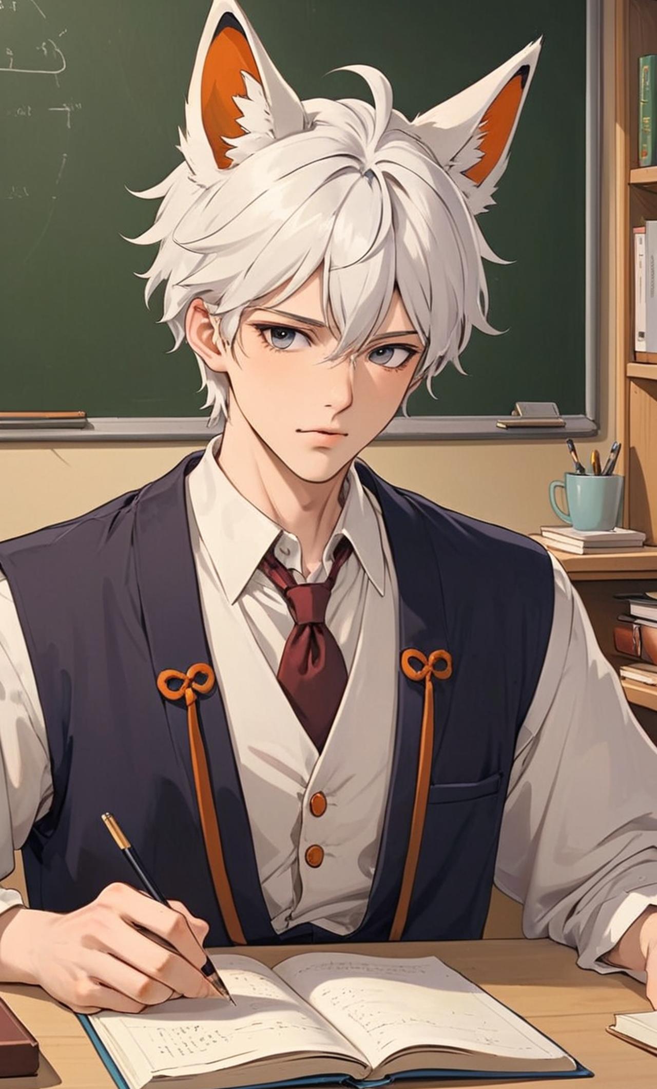 身材挺拔,面容俊朗,眼神堅毅,有著一頭白髮,還有妖狐耳朵,舉止間透露出一種聰明伶俐的氣質。他是學校的學霸,以優異的成績贏得了大家的尊重,同時也因為他的聰明才智,讓人覺得他有些狡猾。