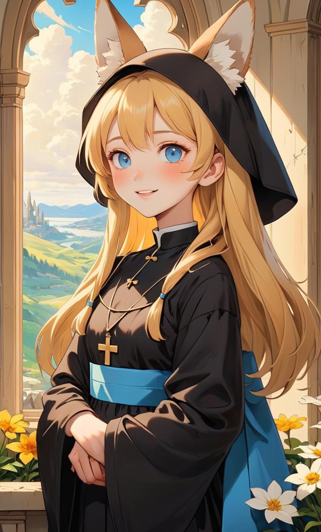 日漫画风,二次元画风,五官标志,4k画质,光影,氛围,长睫毛,颜值高,唯美,非常可爱,黄色长发,头上别着一朵洁白的花,兽耳娘,身着黑色修女服,天蓝色眼睛,可爱的微笑 日漫画风,二次元画风,五官标志,4k画质,颜值高,唯美,非常可爱,萝莉,拥有黄色长发、兽耳娘,有狐狸耳朵,天蓝色眼睛和长睫毛的可爱修女,身着黑色修女服,头上别着一朵洁白的花,微笑着