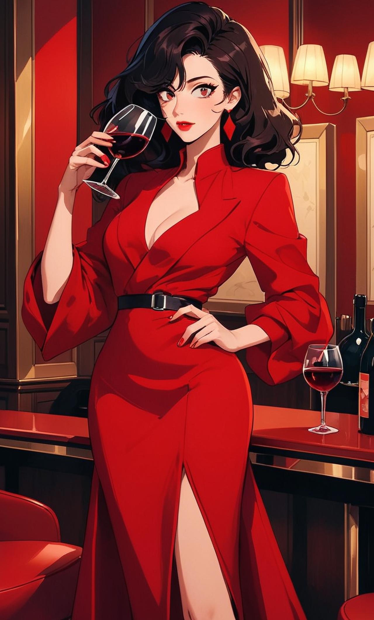 他在一個豪華又大的俱樂部裡面,他擁有黑色長短頭髮,眼睛黑色,穿著紅色衣服紅色高跟鞋,塗著口紅拿著紅酒