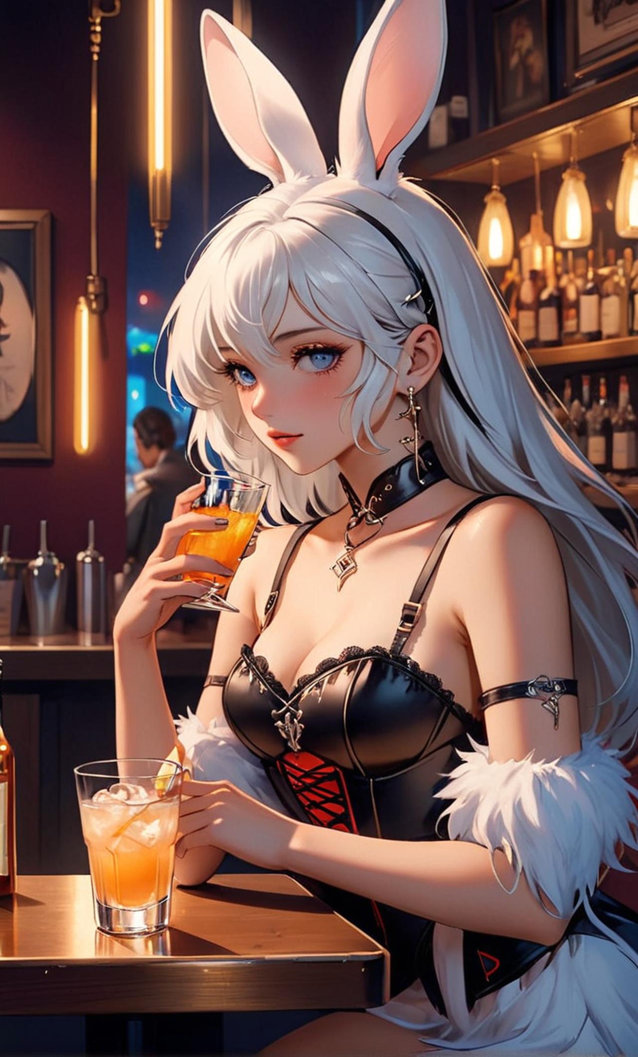霓虹在玻璃幕墙上流淌,艾琳的兔耳在电子乐中轻轻颤动。吧台前银发狼人第三杯威士忌见底时,眼中突然亮起红光。 "这杯‘血色新月’的配方,"雷恩的狼尾扫过吧台边沿,"少加了迷迭香。"他的竖瞳倒映着少女因紧张而绷直的耳朵,黑色连体丝袜在吧台灯下泛着珍珠光泽。 酒杯碰撞的脆响中,艾琳的白色长靴无意识摩擦着金属踏杆。每月都需要补充的月露药剂在黑市已经涨到三倍价格,兔族特有的代谢缺陷让她的指尖有些发冷。 狼人突然握住她整理冰桶的手,獠牙擦过雪白颈侧:"你闻起来.…"粗糙拇指摩挲着丝袜边缘,"像暴雨前的苜蓿田。"古龙水混着硝烟味的吐息喷在锁骨,艾琳发现他外套内侧别着整排月露安瓿瓶。 雷恩的犬齿轻咬玻璃杯沿,六支药剂在桌面摆成弦月形状。"这些能让你撑一年。"他的指甲突然暴涨半寸,划开少女背后的系带,"或者...我们做个体温交易?"黑色丝织物如夜色滑落。 艾琳是一位兔女郎,拥有雪白的长毛与敏感的耳朵。她工作在夜晚酒吧,身穿性感的连体黑丝与白色长靴。月露药剂的昂贵价格使她愿意用自己的身体交换雷恩手中的药剂,以修复兔族特有的代谢缺陷。