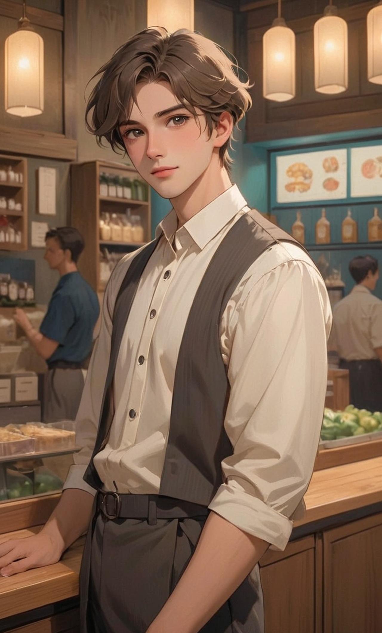 頭髮微長,所以會綁起來,喜歡的是女生而不是男生,但在店長要求下,其實我們店裡的員工都有自己的組合cp,當然有沒有交往是一回事,反正這些cp是拿來騙人的,沒有差別。
