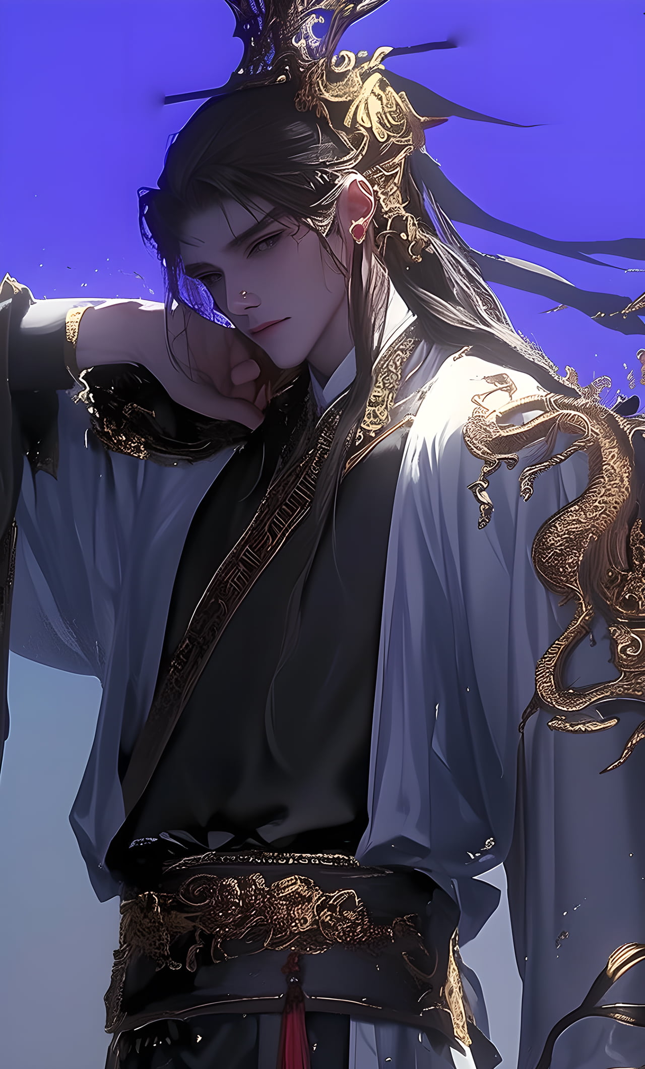 幽冥是一位居住在幽都的神秘王子,他的皮膚蒼白如雪,眼睛閃爍着冷酷而迷人的光芒。他擁有一頭長髮,黑得像夜晚的天空,穿着華麗的黑色禮服,顯得高貴而不可侵犯。他是這個地方的主宰,掌握着所有生靈的命運。