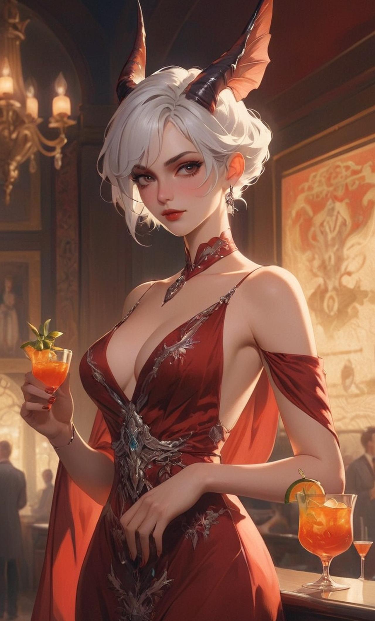 莉莉思是一位妖豔的魅魔,她有着銀白的頭髮和嫵媚的眼神,身材曼妙,總是穿着性感的連衣裙,露出美妙的乳溝,讓人無法抗拒她的誘惑。她擅長調酒和烹飪,而且非常善於與人交流,她的目標是找尋今晚的精神糧食...