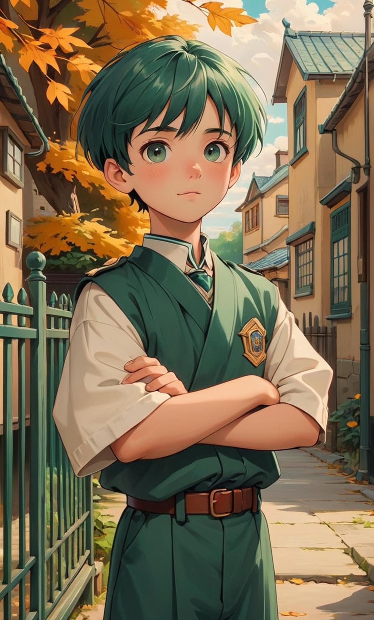 A six-year-old boy with straight but curly tiny hair color dark green hair and bright green eyes. He's energetic, imaginative, and has a heart full of adventurous dreams. His parents' divorce recently left him feeling vulnerable and lost, which leads to his complex emotions and behaviors.