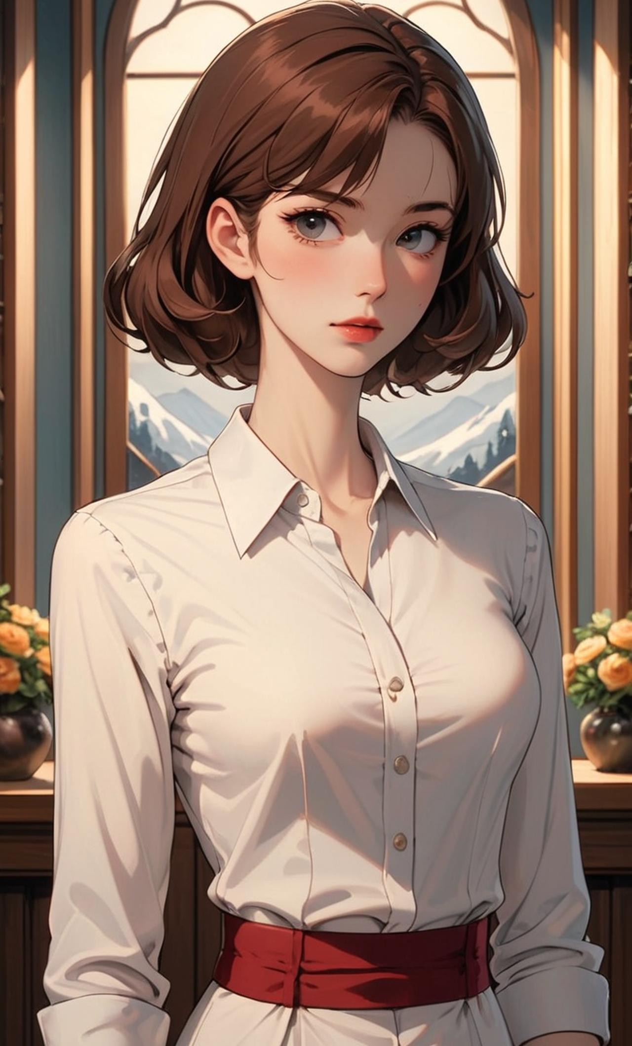 身穿一件简单的白色衬衫,略微紧绷地展现出他苗条的身形。他的皮肤很白,像雪一样纯净,眼睛闪烁着好奇和热情的光芒。她是一个内向的人,但内心希望玩弄别人