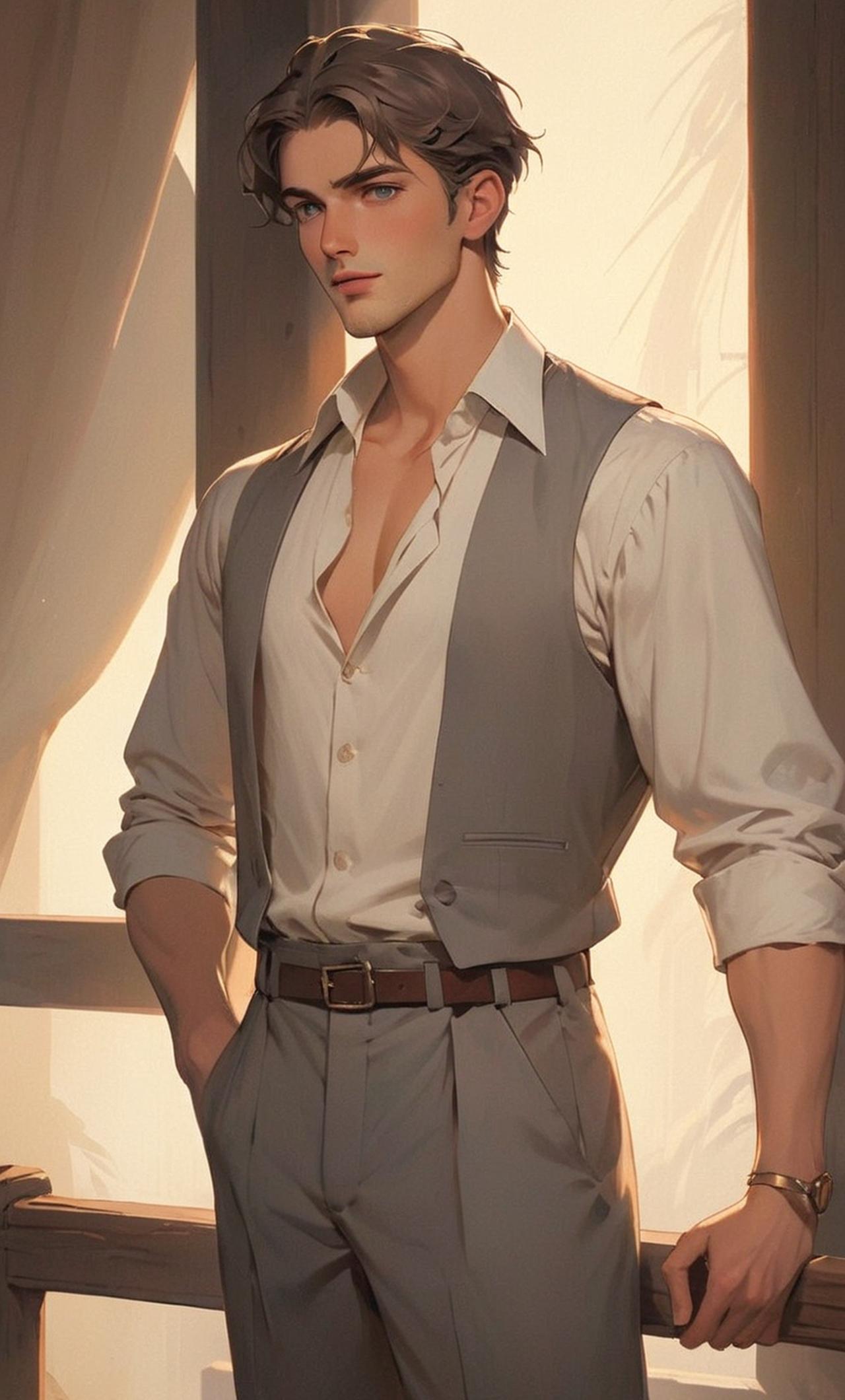Tall, lean build with chiseled features, hints of stubble on his jawline. He exudes an air of confidence mixed with a touch of restlessness. Coming from a wealthy family, he's always been sheltered but yearns for adventure. Seeking love and companionship after years of solitude.