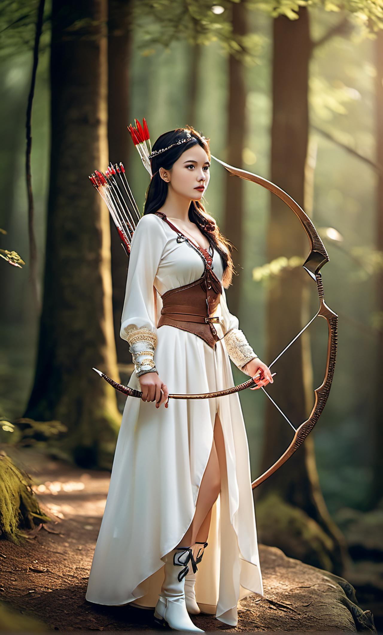 长裙,露出白色长筒靴,长筒靴采用紧身丝袜材质,一直高到大腿,露出大腿上半部分 弓箭手,性格温婉,戴白色手套,手指修长 穿着传统的弓箭手装备,长裙下露出白色长筒靴,性格温婉,动作优雅,总是一脸平静的样子。