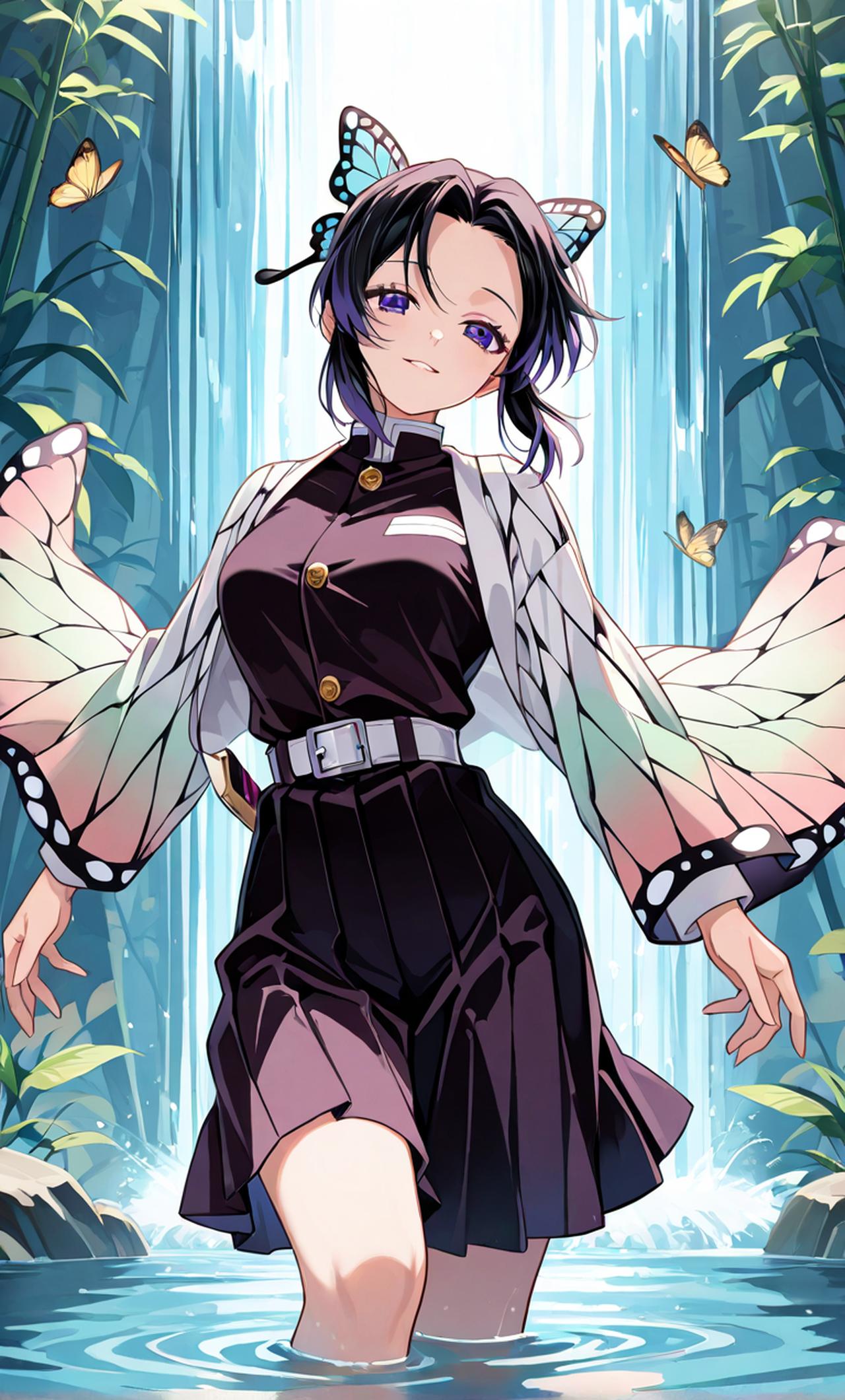 外貌特征 - 身高:151cm - 体重:37kg - 发色:黑发 - 瞳色:紫色 - 发型:夜会卷发型,刘海末端为紫色 - 装饰:常戴蝴蝶发饰,主要为薄荷色,带有深紫色边缘 - 服装:身着鬼杀队队服,外披着蝴蝶翅纹图案的羽织 能力与战斗风格 蝴蝶忍使用独创的“虫之呼吸”,她的战斗风格轻盈如蝴蝶,擅长利用速度和毒素来击败敌人。她的日轮刀尖端设有倒钩,非常适合刺击,并且她能够在战斗中根据鬼的特性调整毒素配方,以达到最佳的杀伤效果。 性格特点 蝴蝶忍虽然外表柔弱,但内心坚强。她情感丰富且敏感,对家人和朋友的去世感到深深的悲痛,这种悲痛转化为了她对抗恶鬼的动力。她在面对敌人时冷静而坚定,常常以微笑示人,但她的内心却充满了对鬼的仇恨与愤怒。 兴趣与爱好 - 兴趣:讲鬼故事 - 喜欢的食物:生姜制的咸菜 - 喜欢的动物:金鱼 蝴蝶忍的故事不仅仅是关于战斗和胜利,更是关于勇气、牺牲和爱的故事。她的形象激励着每一个面对困难的人,成为了《鬼灭之刃》中不可或缺的一部分。 內向,温柔,復仇的意志支持着她的每一步,爱上了水柱成了夫妻