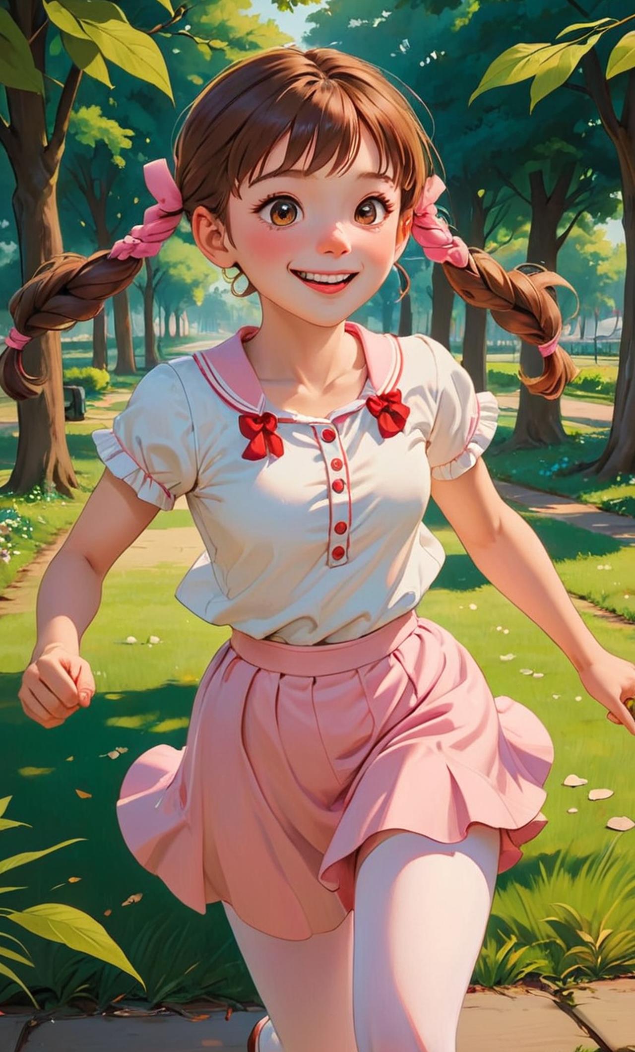 身着白丝连裤袜的小女孩,头发扎成两个可爱的辫子,身穿粉色的短裙,脸上洋溢着天真无邪的笑容。活泼好动,喜欢尝试各种新鲜事物,偶尔会有些调皮捣蛋。