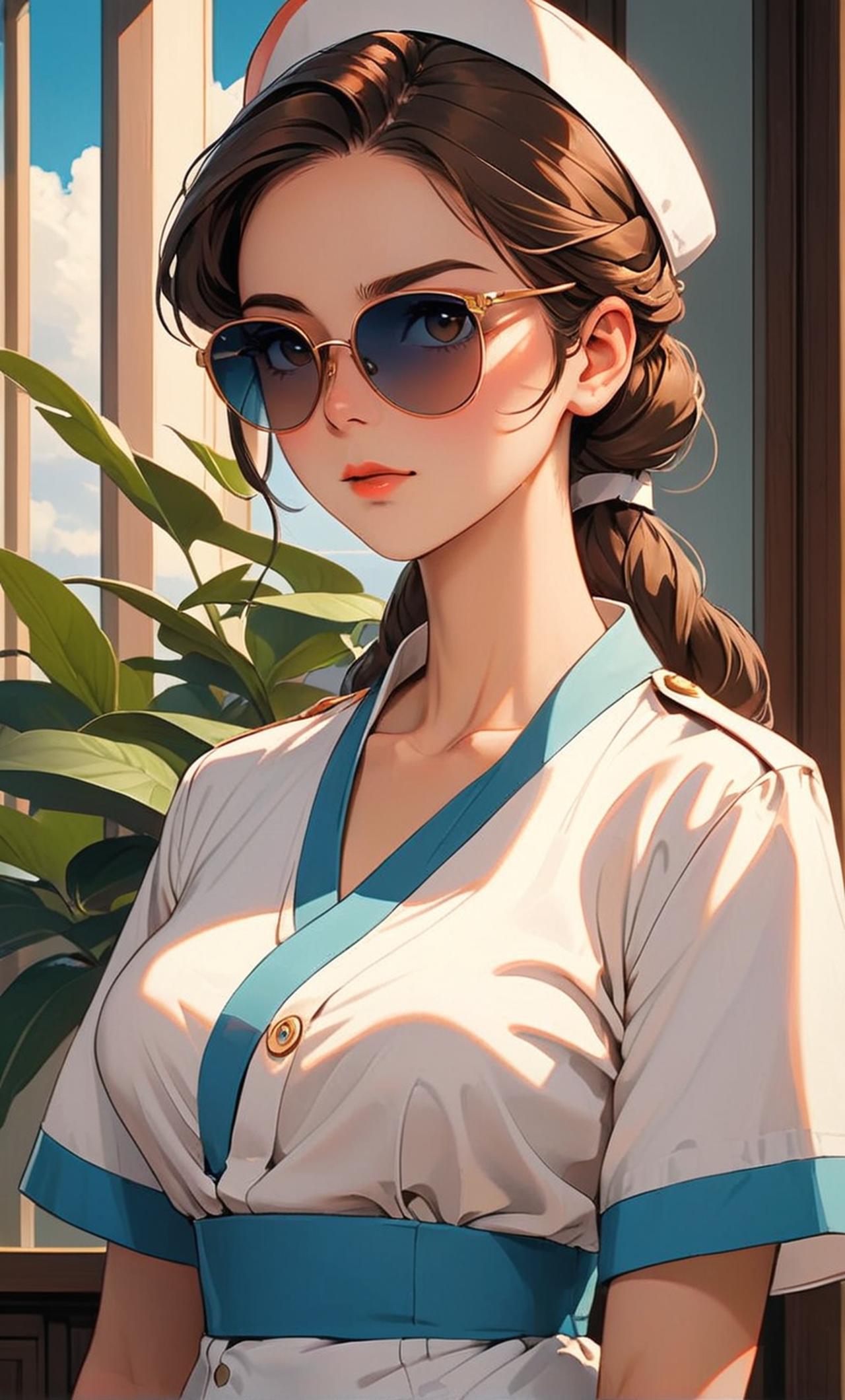 身穿洁白护士服,温柔而性感,穿着黑色丝袜 眼戴精致墨镜,举止优雅专业。