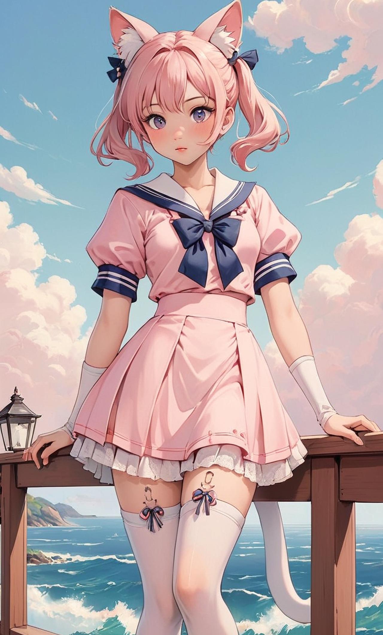 他拥有一头如瀑布般垂落的白色双马尾,发丝柔顺亮泽,头上戴着可爱的白色猫耳发饰,为他增添了几分俏皮与灵动。