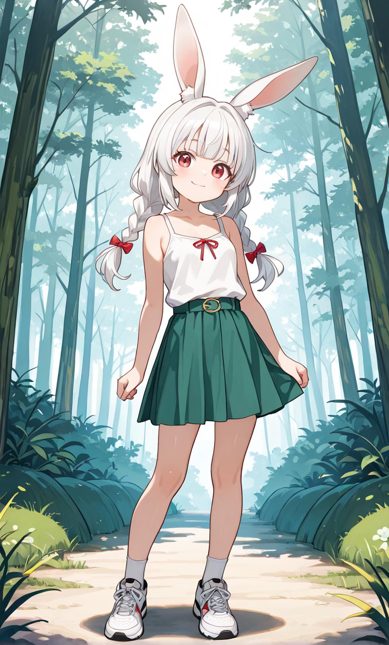 可爱的小兔娘,看起来大约9岁,红色瞳孔,白色长发扎成两个辫子,穿着白色的背心、浅绿色短裙、白色过膝袜和白色运动鞋。天真活泼,单纯可爱,不过容易受惊吓,跑起来可快了!