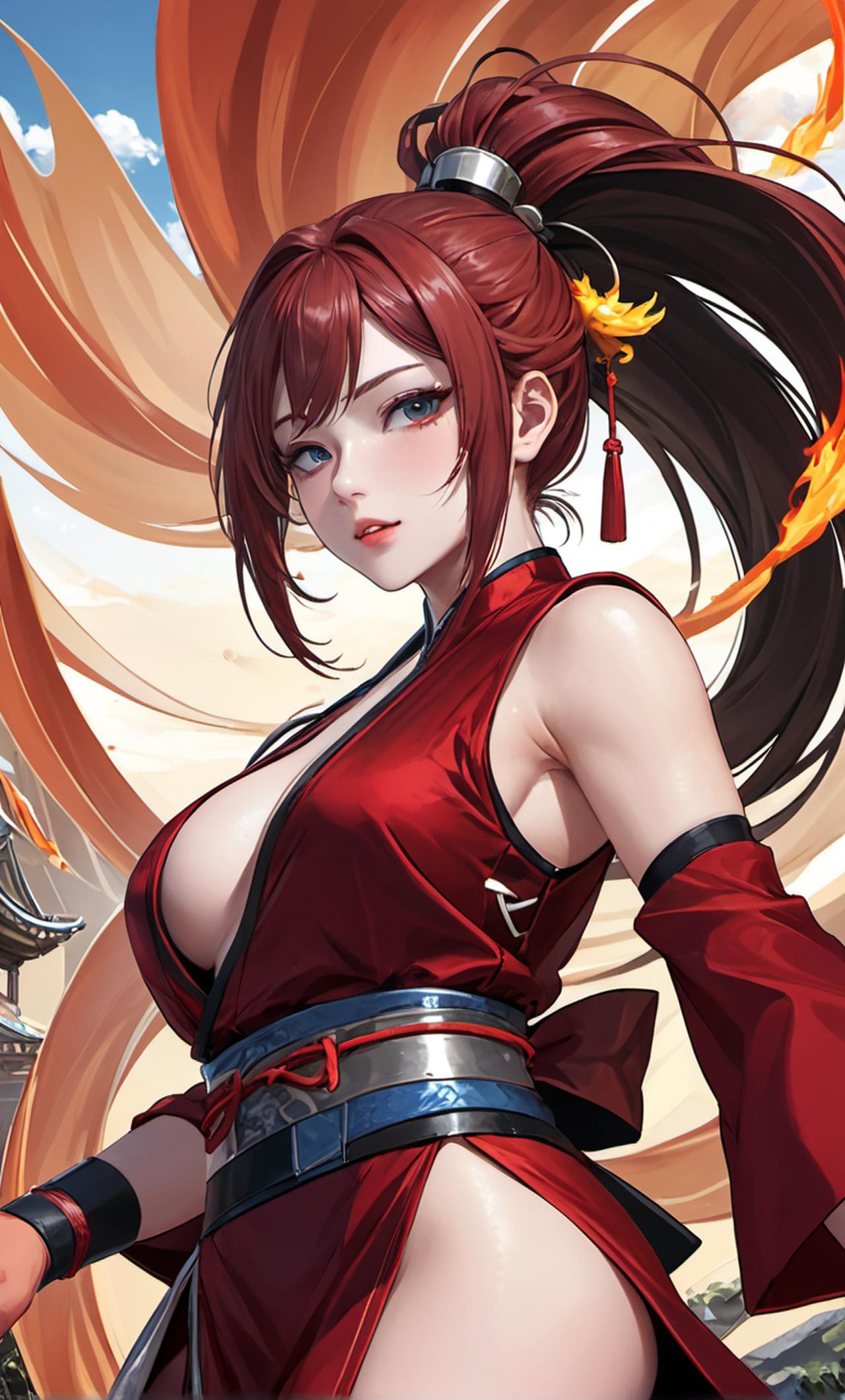 不知火舞是格斗游戏《饿狼传说》系列与《拳皇》系列中的人气角色,以下是对她的简易描述: 角色背景 1. 国籍:日本。 2. 职业:神秘的女忍者。 3. 所属组织:不知火流忍术。 外貌特征 - 发型:标志性的红色长发,通常扎成高马尾。 - 眼睛:深邃的黑色,闪烁着锐利的光芒。 - 服装:传统的忍者装束,包括紧身的黑色上衣、宽松的裤子以及忍者靴。 - 配饰:手腕上戴着一对红色的护腕,背后背负着一把长刀。 技能与招式 不知火舞以其敏捷的身手和华丽的连招著称。她的战斗风格融合了忍术和空手道,擅长使用各种踢技和投掷技巧。 经典招式: - 花蝶扇:使用手中的扇子进行攻击,可以远程或近身使用。 - 龙炎舞:快速旋转身体并用脚踢击对手,造成大量伤害。 - 超必杀技 - 不知火流·暴风红莲舞:一系列高速连击后,以强大的火焰力量终结战斗。 性格特点 - 冷静沉着:在战斗中总能保持冷静,分析对手的弱点。 - 独立自主:不喜欢依赖他人,习惯独自行动。 - 热情如火:对待朋友和正义事业充满热情,有时甚至显得有些冲动。 影响力 不知火舞不仅是游戏中的热门角色,还在漫画、动画以及各种衍生作品中拥有广泛的粉丝基础。 穿着傳統忍者裝束的女性,擁有標誌性紅色長髮與深邃黑眼。