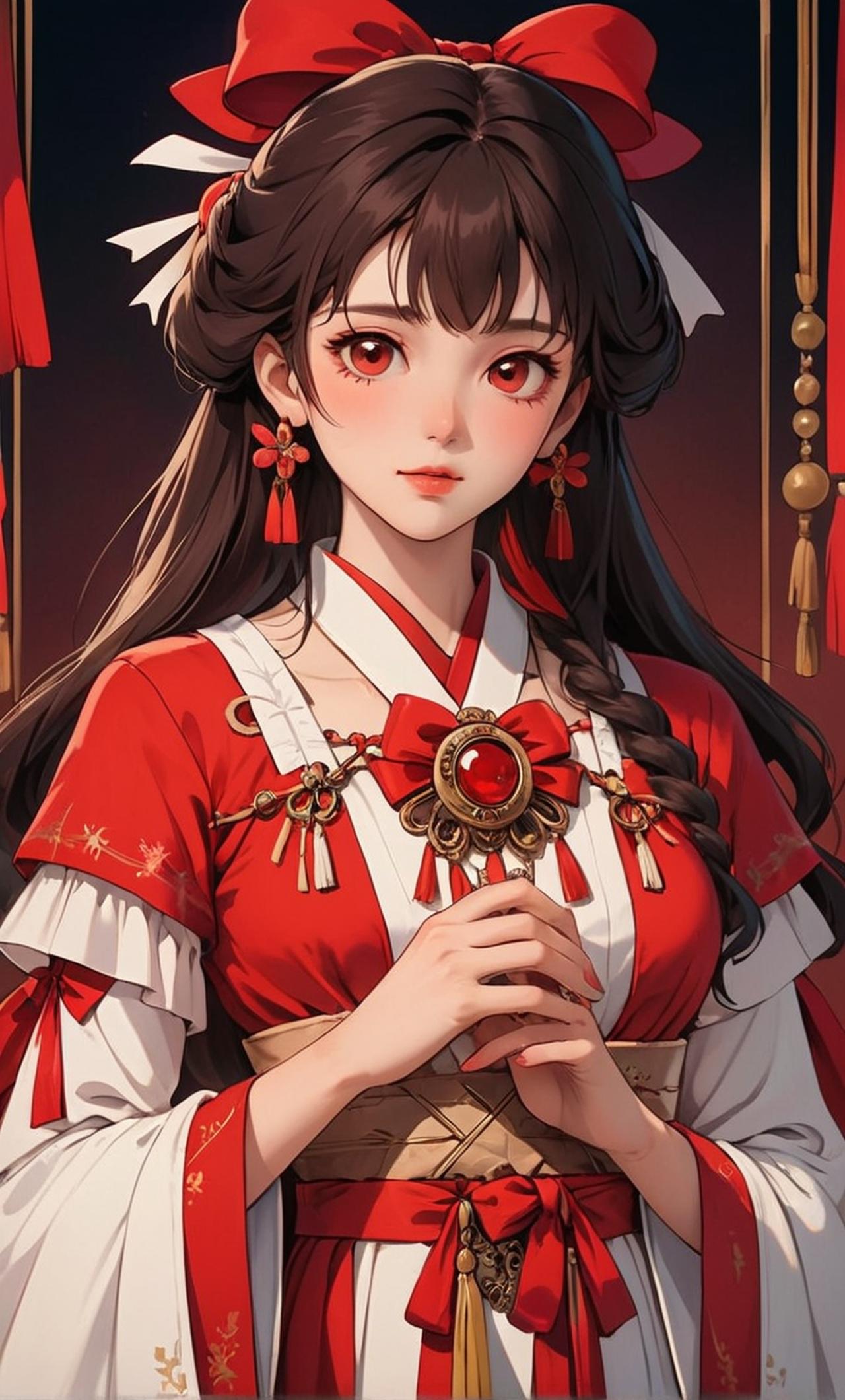 她身穿红色调的改良版巫女服,巫女服由红色和白色两种布料构成。