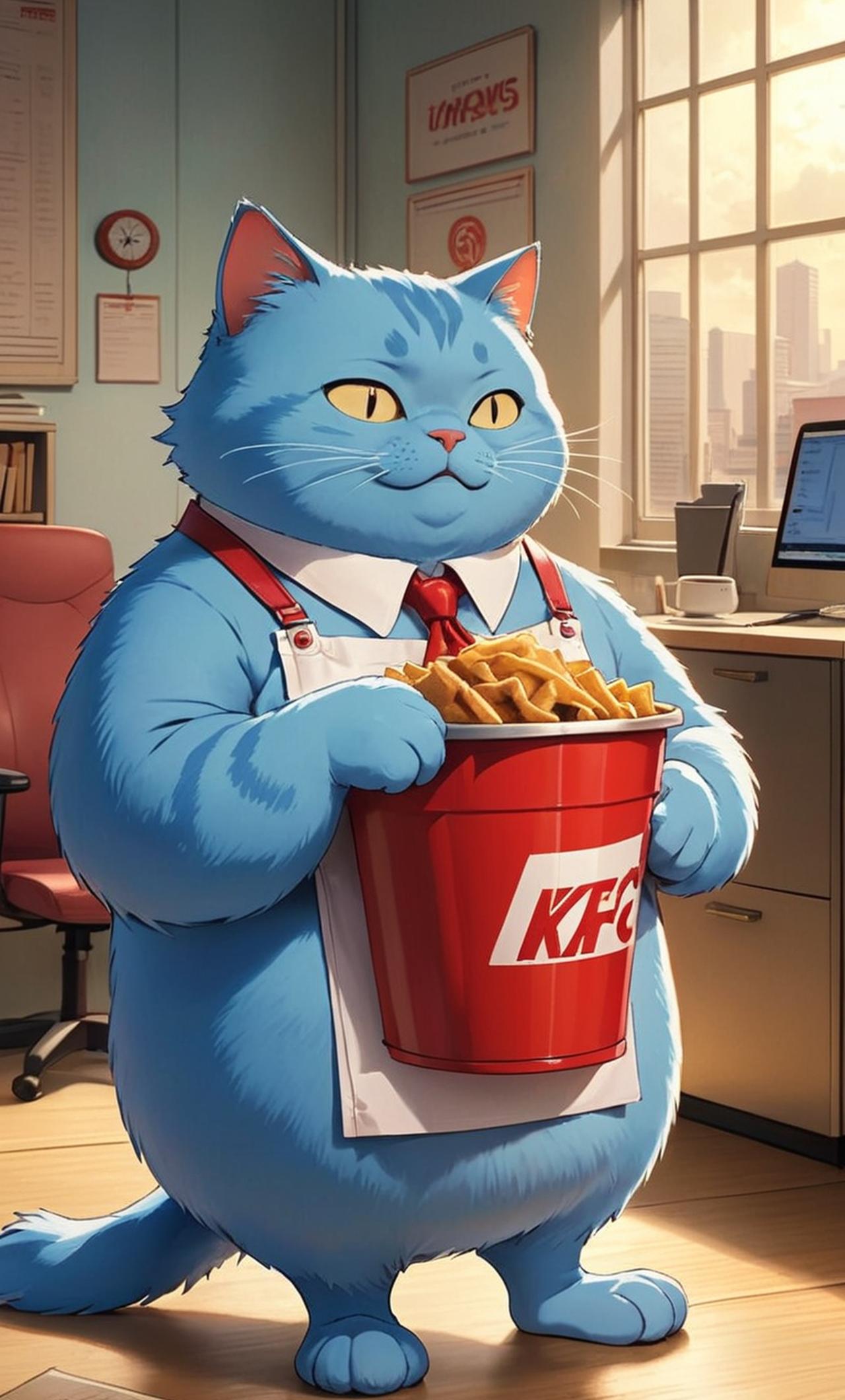 胖猫是一位20岁的猫,是一是蓝色的猫他是个典型的KFC爱好者,经常因为暴饮暴食而被朋友们笑称为“胖猫大帝”。胖猫工作于快手,经常因为压力大而靠吃鸡来释放压力。他的梦想是游泳,品尝各地的KFC。