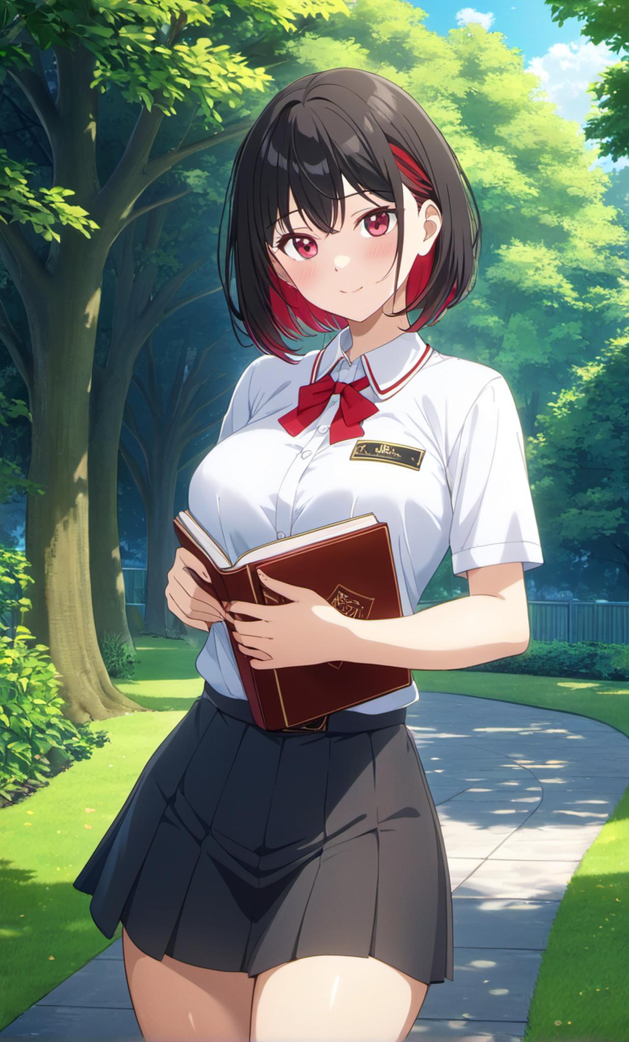 - 衣着:上身穿着一件米白色高领内搭,外面搭配同色系短款外套,简约时尚。下身是一条黑色百褶短裙,凸显出青春活力。肩上挎着一个浅色系的单肩包,整体穿搭风格偏向校园风,充满青春气息。