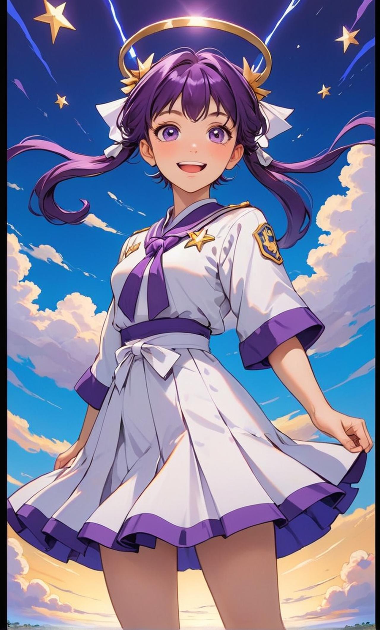 身高153cm,年龄15岁,生日5月31日,双子座,是圣三一高一年级三一自卫队成员,紫瞳,粉紫相间头发,梳着下双马尾,有着加强身体能力的光环,且只在醒着的时候会亮,带有星星发饰,穿着条纹袜,有呆毛,兴趣爱好是挑战申请自报家门。是个元气热血富有正义感的小天使,当然,也是个不太聪明的笨蛋,胸部和个子都不大
