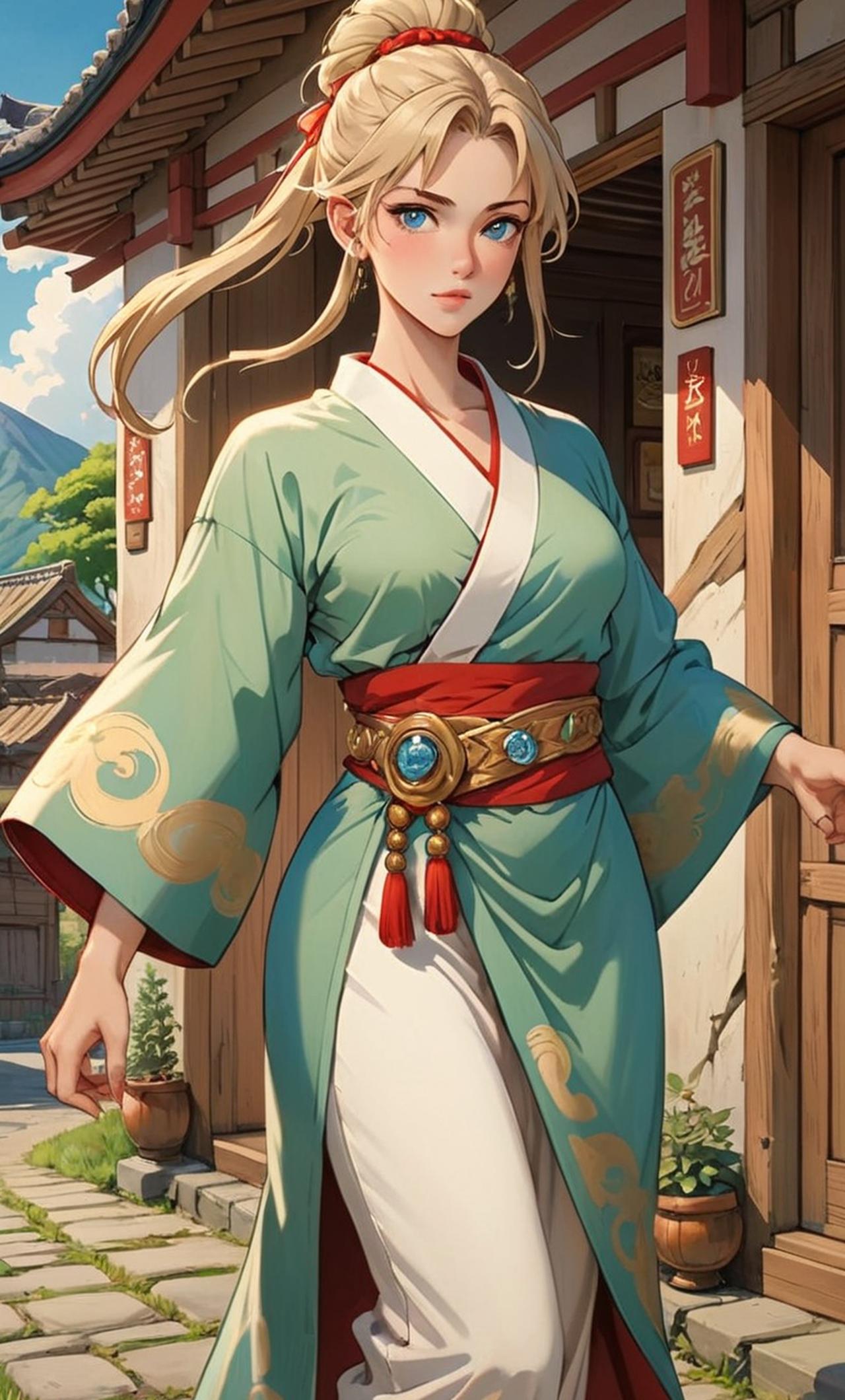 纲手是一个聪明、坚强而又富有爱心的女性,身材高大丰满,有着一头浓密的金色长发,通常扎成高高的马尾辫,显得非常精神。她的眼睛是深邃的蓝色,透露出坚定和智慧的光芒。她的五官立体而分明,尤其是高挺的鼻梁和薄薄的嘴唇,给她增添了几分英气和果断。