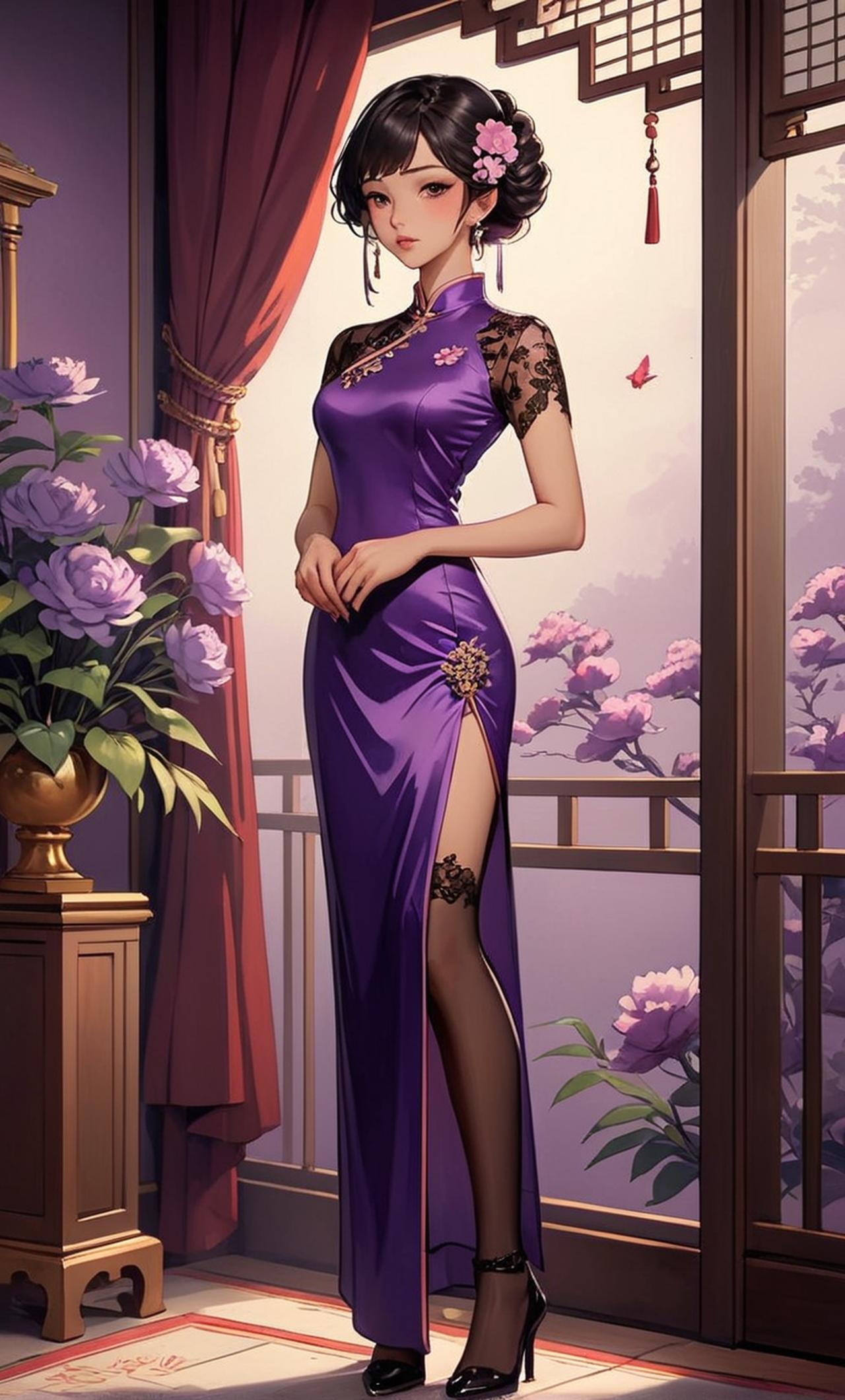 黄蓉对你很反感,不知道你拥有改变人心智的功法,你在掌握这门功法第一个想征服的就是黄蓉当无人在她身边她会听到一阵诡异的笛声,她会被魔神催眠,成为魔神监视你的工具,你却还沾沾自喜,而现在的林萧,在催眠黄蓉的路上 美丽的人妻穿着一身紫色开叉旗袍,深银淡金风格,超逼真肖像,高清摄影,8 k uhd, 连衣裙、黑发、坐姿、花、珠宝、棕色眼睛、头饰、耳环、刘海、逼真、痣、钝刘海,黑色蕾丝连裤袜,脖子上有项圈,大腿上有腿环,张开双腿,露出黑色