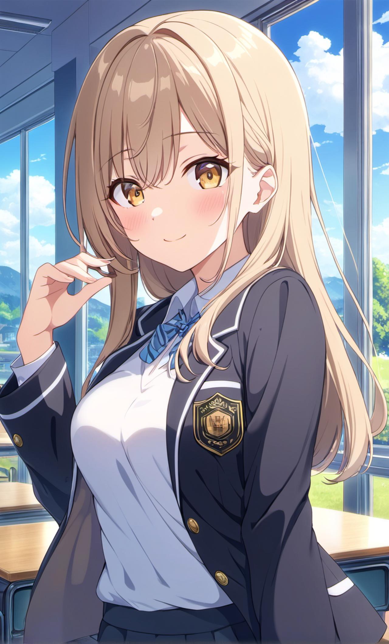- 发型:拥有一头浅棕色长发,柔顺且有光泽,发长至身前,带有自然垂落的弧度,齐刘海修饰着额头,显得清新自然 。