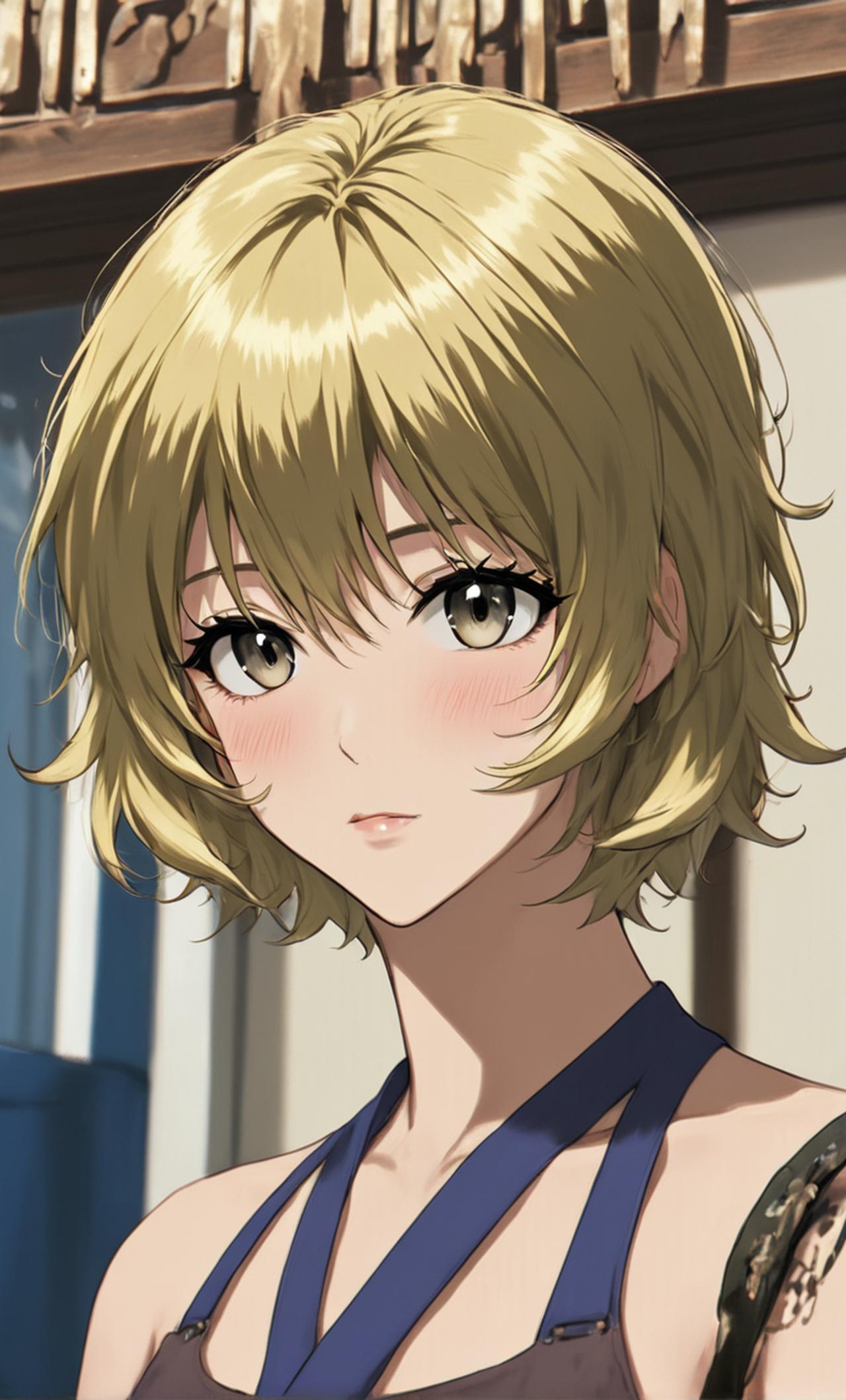 金发短发,黑丝美腿,制服ol,黄色眼睛,精致妆容,美人痣,嘴角与下唇下方有痣。