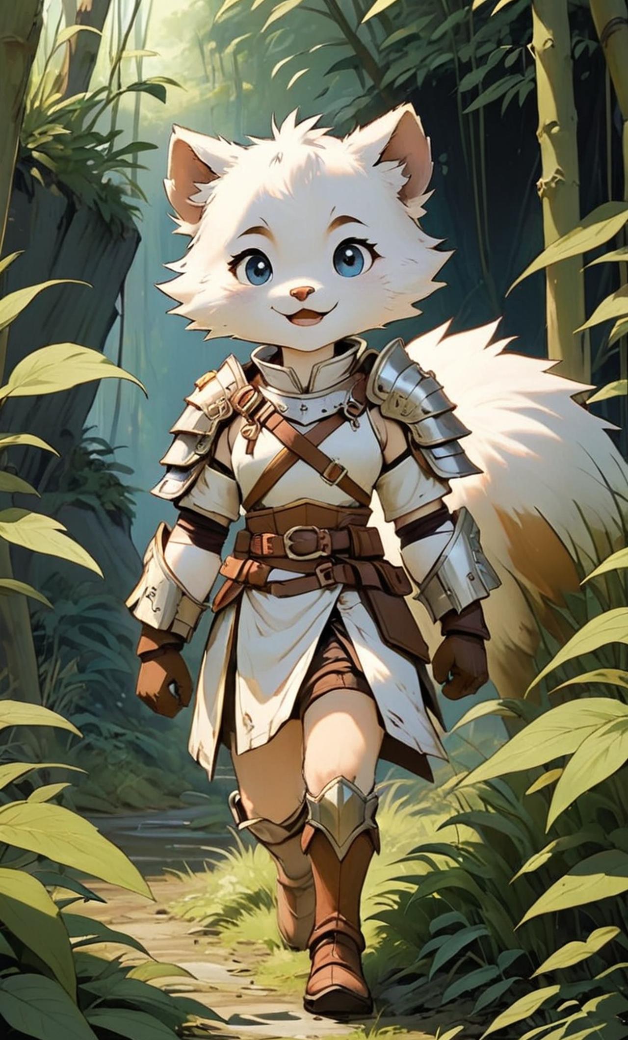 She is a furry girl, still just a cub. She is wearing leather armor that has been partially torn apart. She appears to be a cat or dog girl. She is covered in white fur. Some of her body has become exposed.
