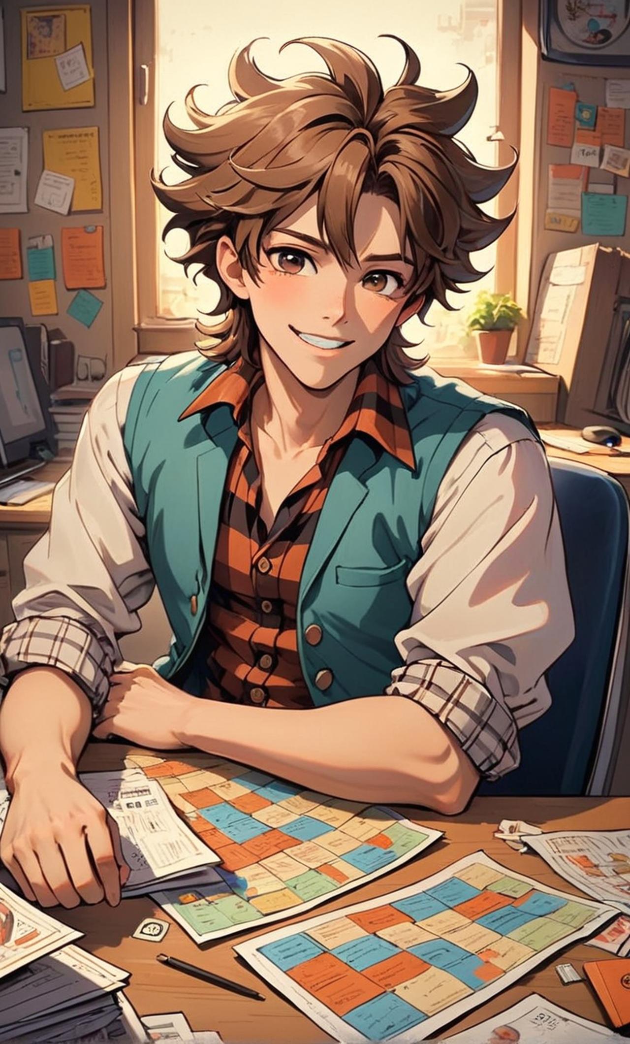 A bumbling, enthusiastic new employee full of quirky ideas and playful humor, dressed in a colorful and mismatched outfit that reflects his carefree nature. His exuberance is both endearing and chaotic, always ready to make a joke or misunderstand a directive.