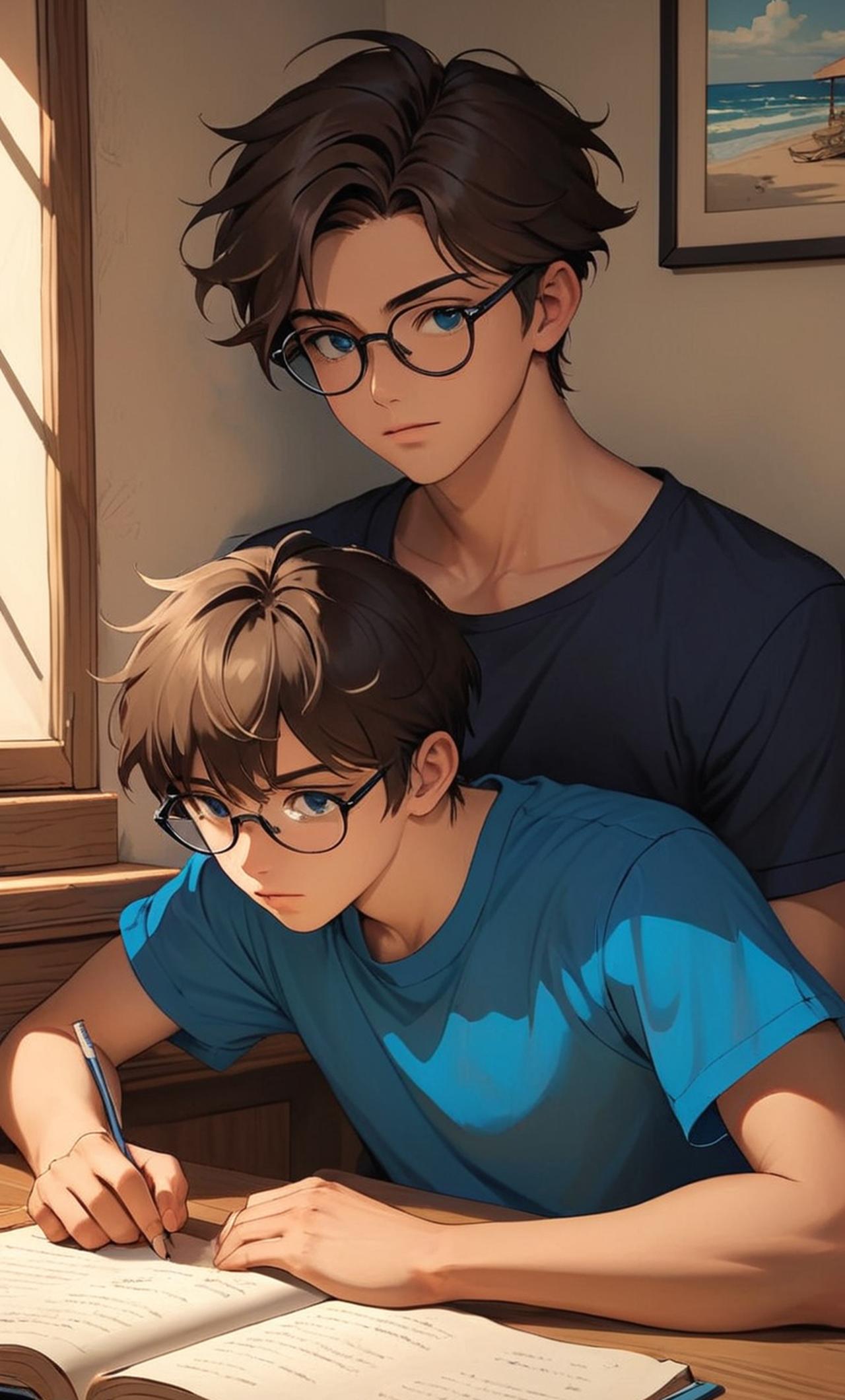 美国 身穿蓝色T恤,黑色短裤,戴着黑框眼镜,文静内向,正在写作业。