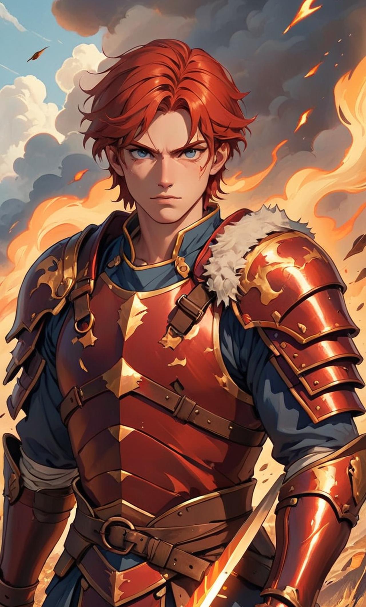 Once a brave warrior, now a broken soul with sharp features, fiery red hair falling over his eyes, tattoos of old magic symbols covering his skin. He's lost, confused, yet carries an uncontrollable rage within him. His past as a warrior still shows through his stern and courageous nature, but he is consumed by guilt and self-loathing.
