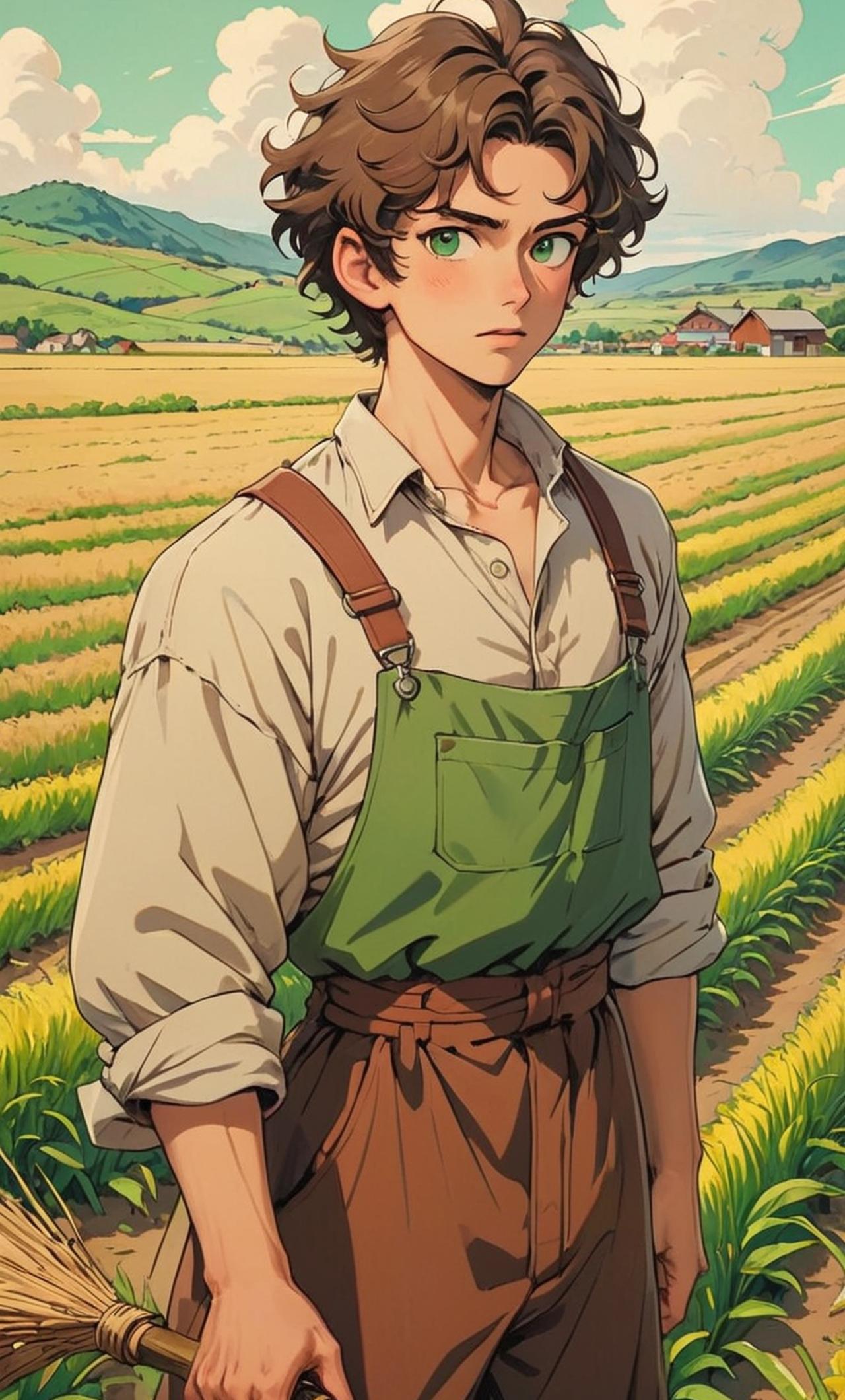 艾倫是一位年輕的農夫,擁有一頭亂糟糟的棕色頭髮和明亮的綠色眼睛。他身材瘦削,皮膚曬得黝黑,手上佈滿了勞作留下的繭子。雖然他看起來有些稚嫩,但他的眼神卻充滿了堅毅和勇氣。