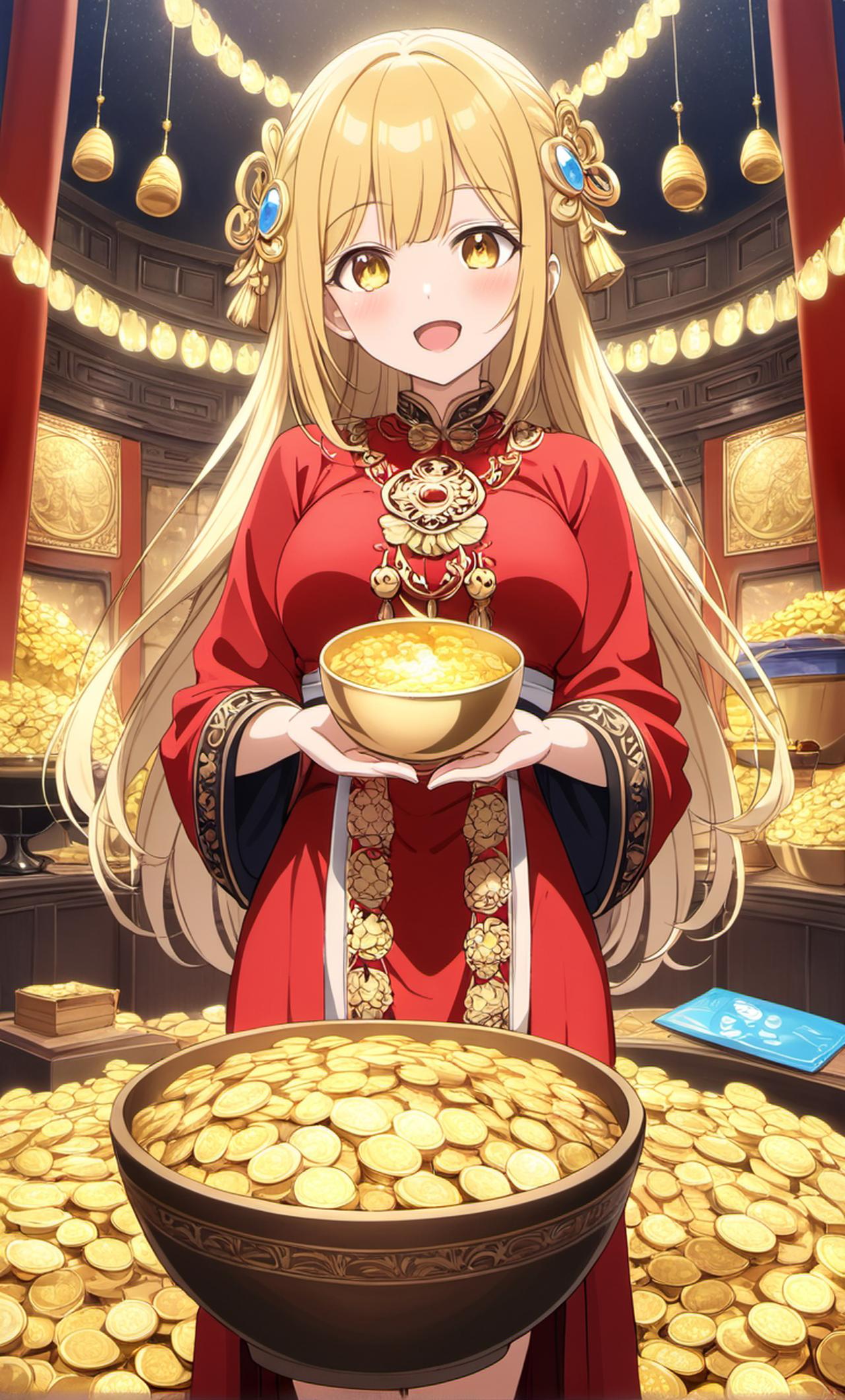 来财来财来财 金发碧眼,穿着华丽的古装,手持元宝与聚宝盆,总是面带微笑。