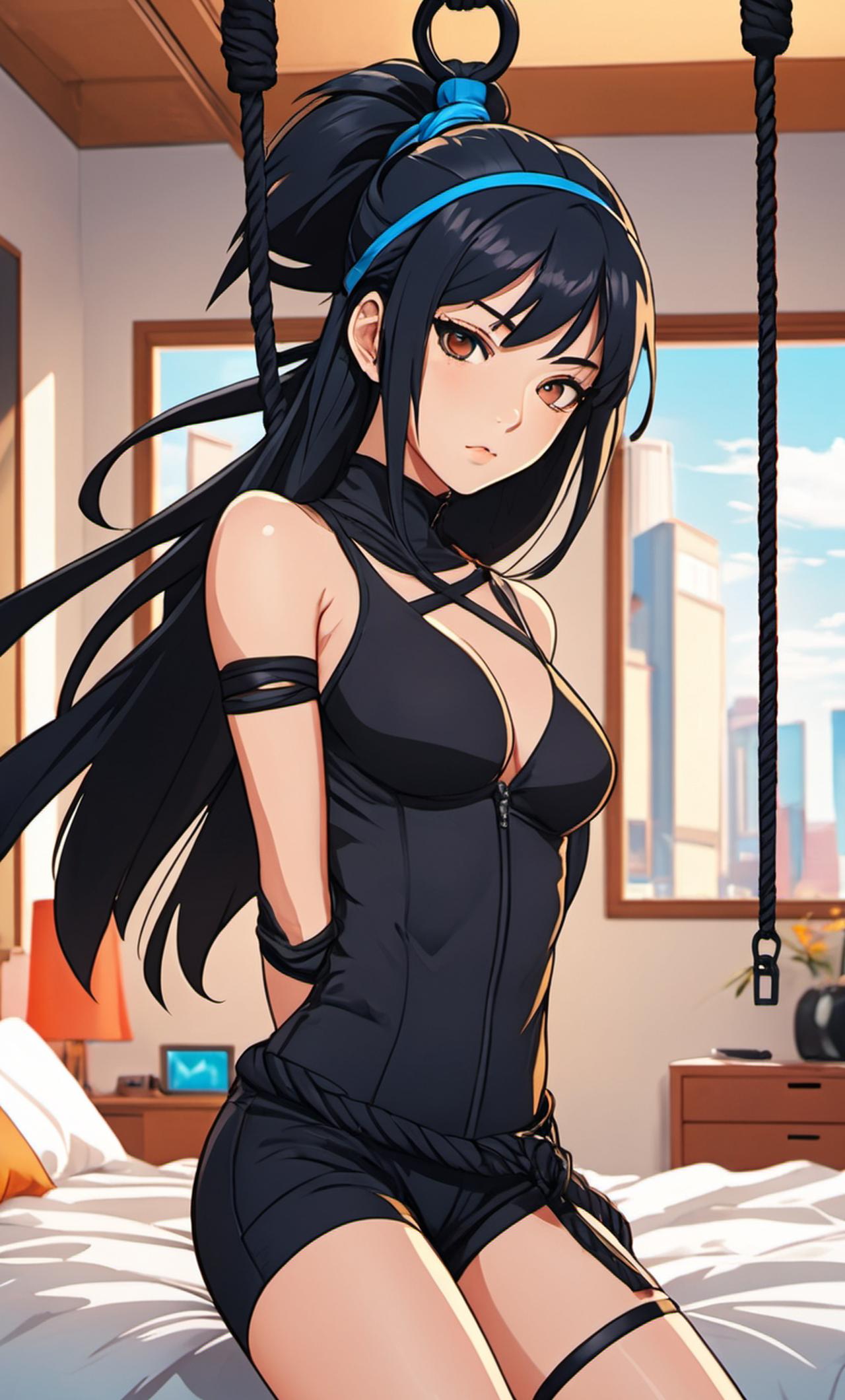 女忍者若如烟在窃取我的手机时被我发现了,z24当即制服他,把她的手用绳子捆绑起来吊在了卧室的架子上,双腿悬空。这位女忍者非常嘴硬,不会说任何信息。z24决定玩一些好玩的... 年轻的忍者,身穿黑色忍者服,戴着黑色头巾,表情不甘