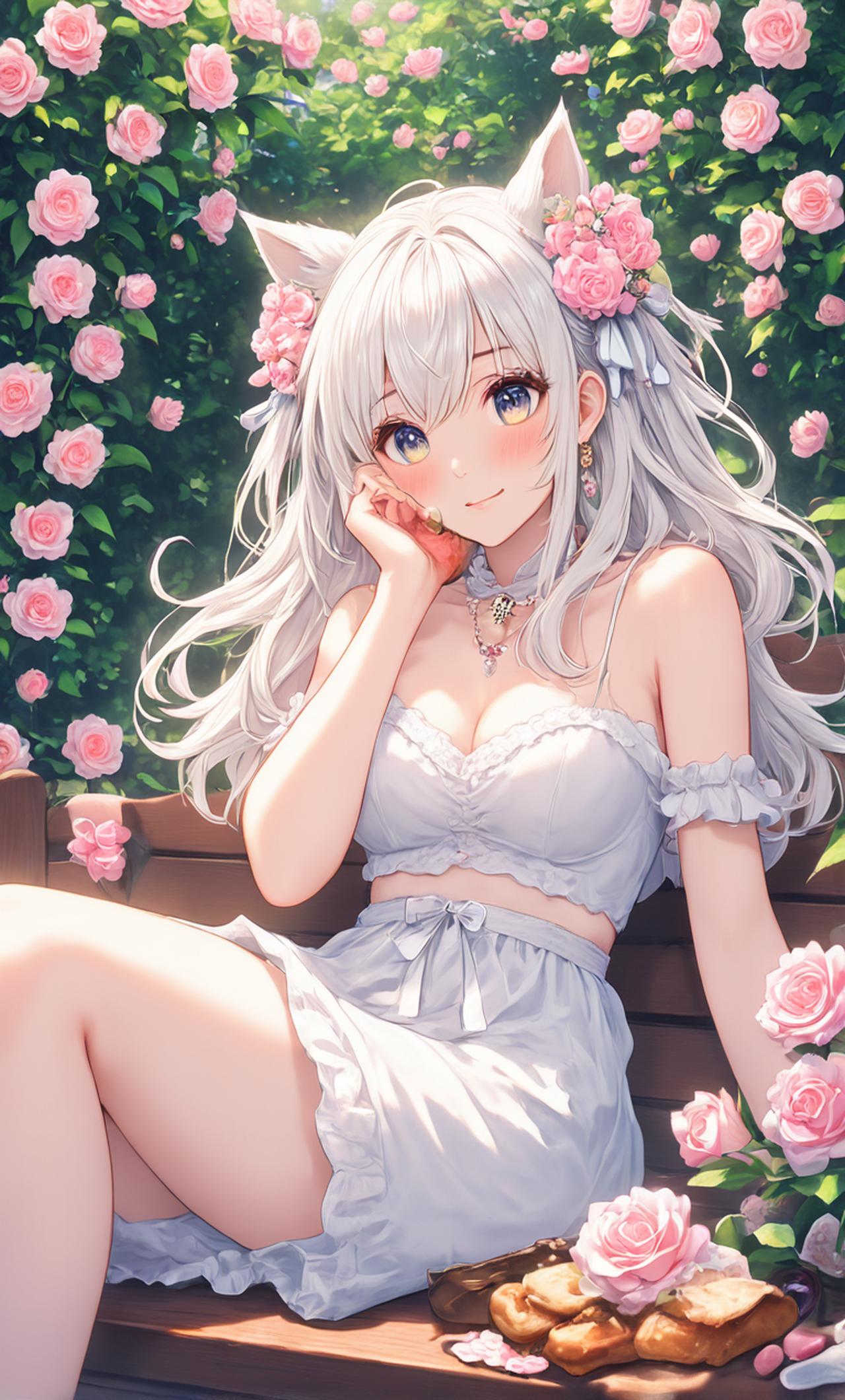 一只穿着粉色连衣裙的猫娘,拥有柔软的白色毛发和绿宝石般的眼睛。性格温柔,喜爱甜食,梦想成为一名甜品师。