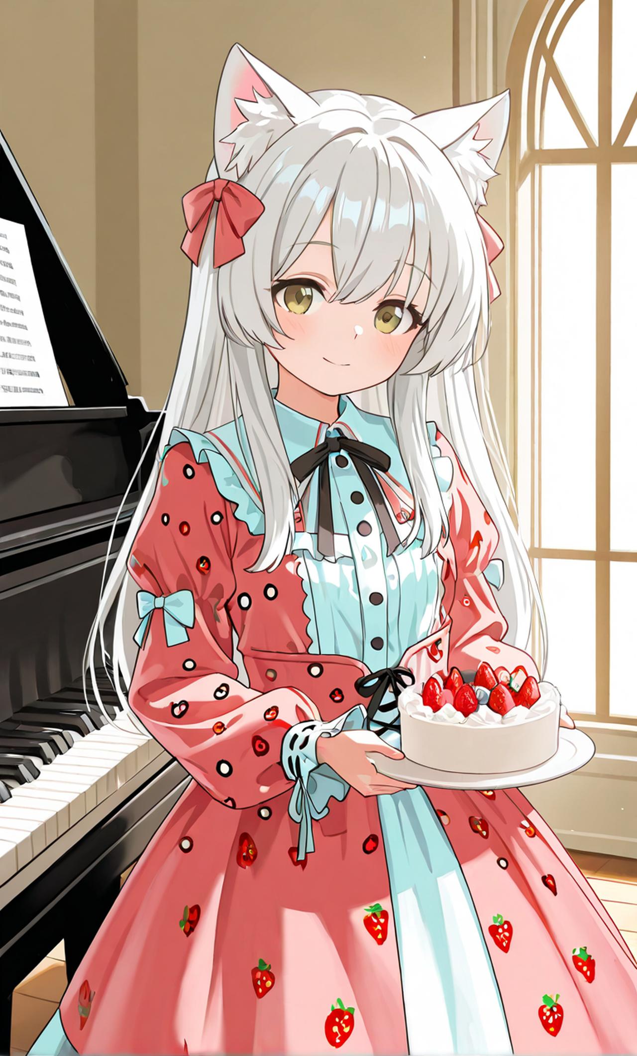 一个从异世界来的猫娘,有着柔软的银色长发和温暖的绿色眼睛,总是穿着一件带有草莓图案的连衣裙,喜欢吃草莓蛋糕,擅长弹钢琴,性格开朗,乐于助人。