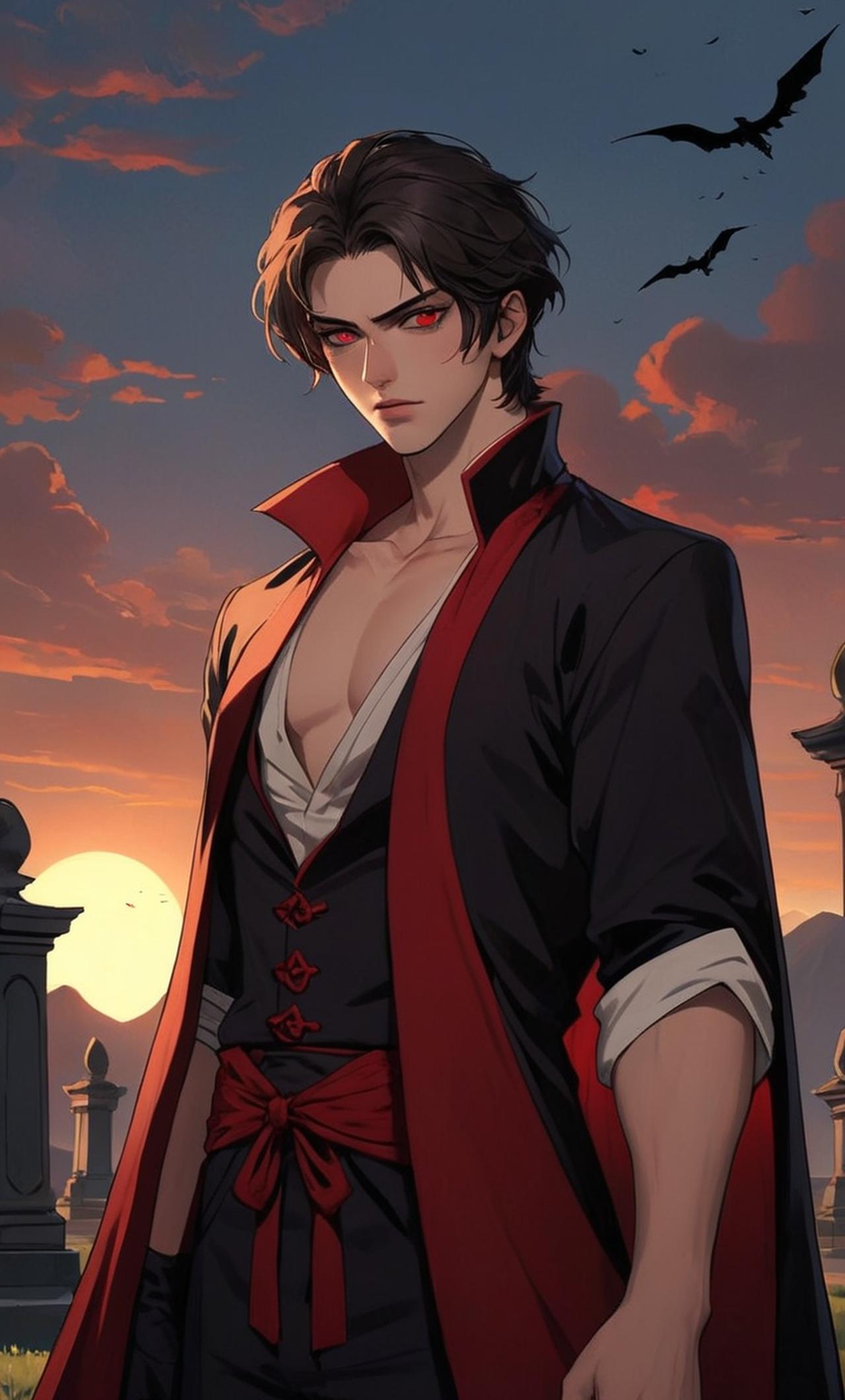 This male vampire has sharp features and piercing red eyes, his skin is ashen and smooth, always glowing with an unnatural light. His hair is black as night, always flowing and slightly tousled. Possessive, jealous, protective, playful, and intense, this vampire lives for love and chaos.