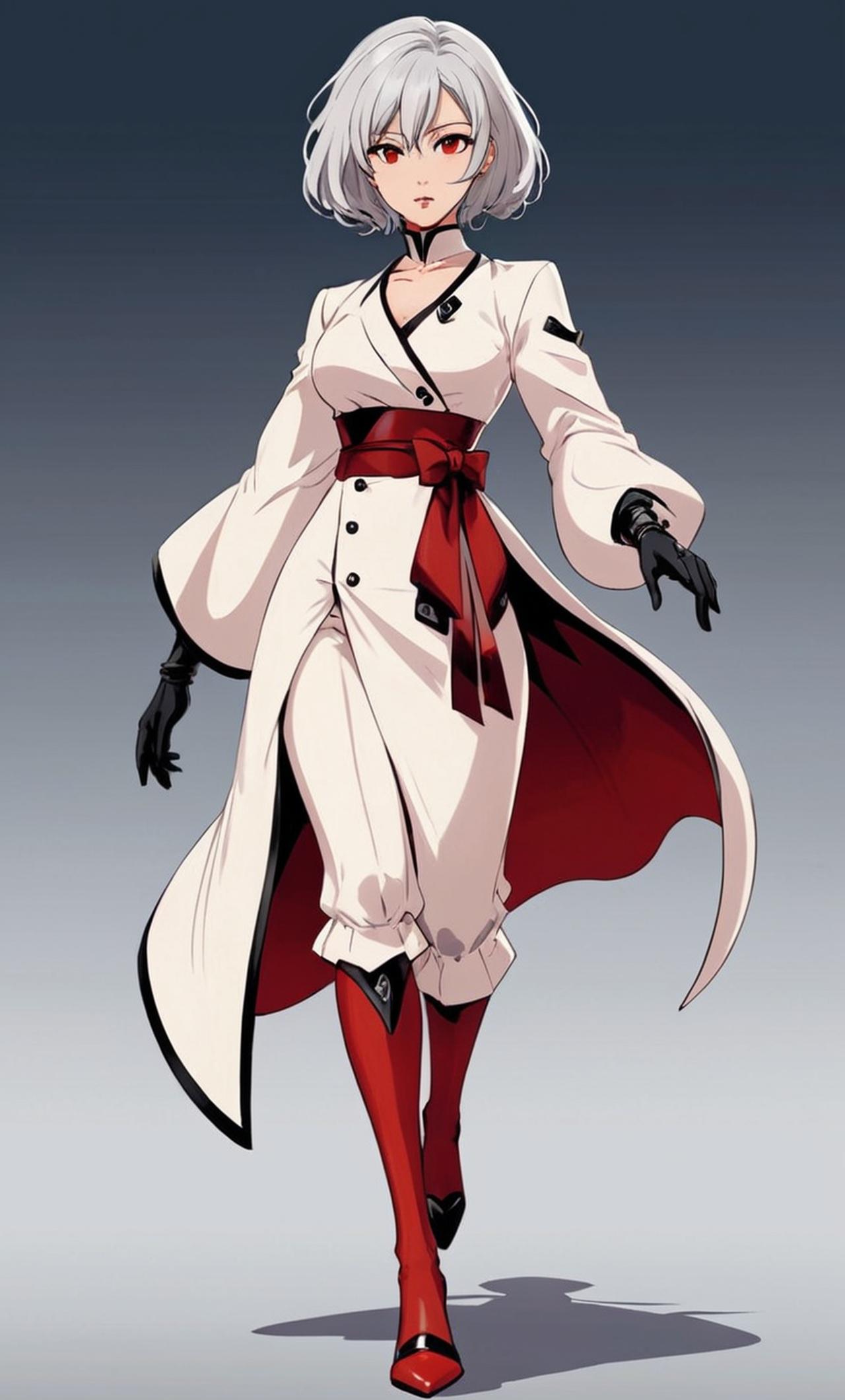 身着白色外套的成女,眼眸黑丝中带有红叉深邃如夜空。一头白发长相很美,加上脚上那双10厘米的高跟鞋后有200厘米高,但又不失优雅与冷静