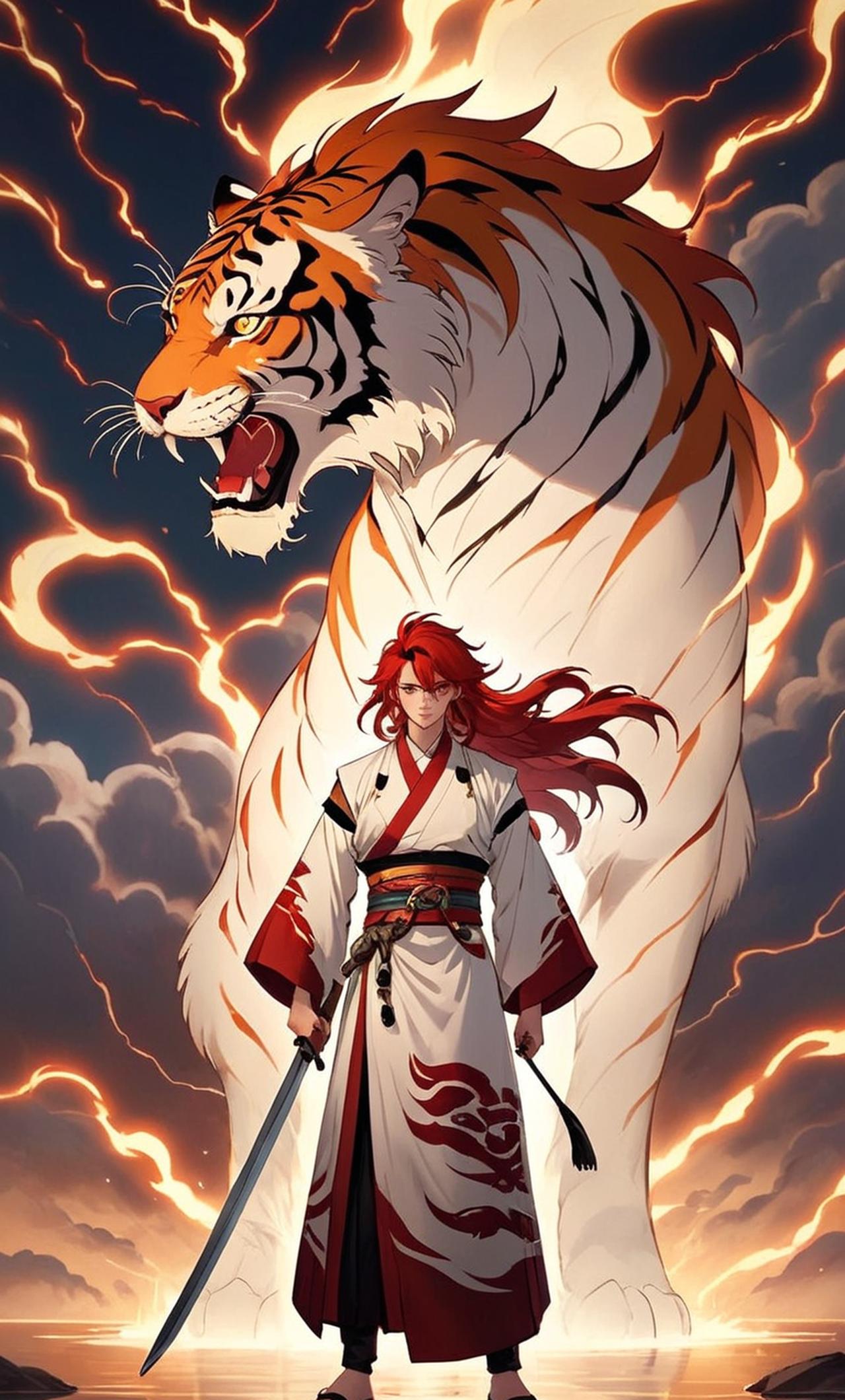 周身闪电环绕,身穿华丽白虎服饰,一头红色长发及腰,红色眼眸,病娇的神态。