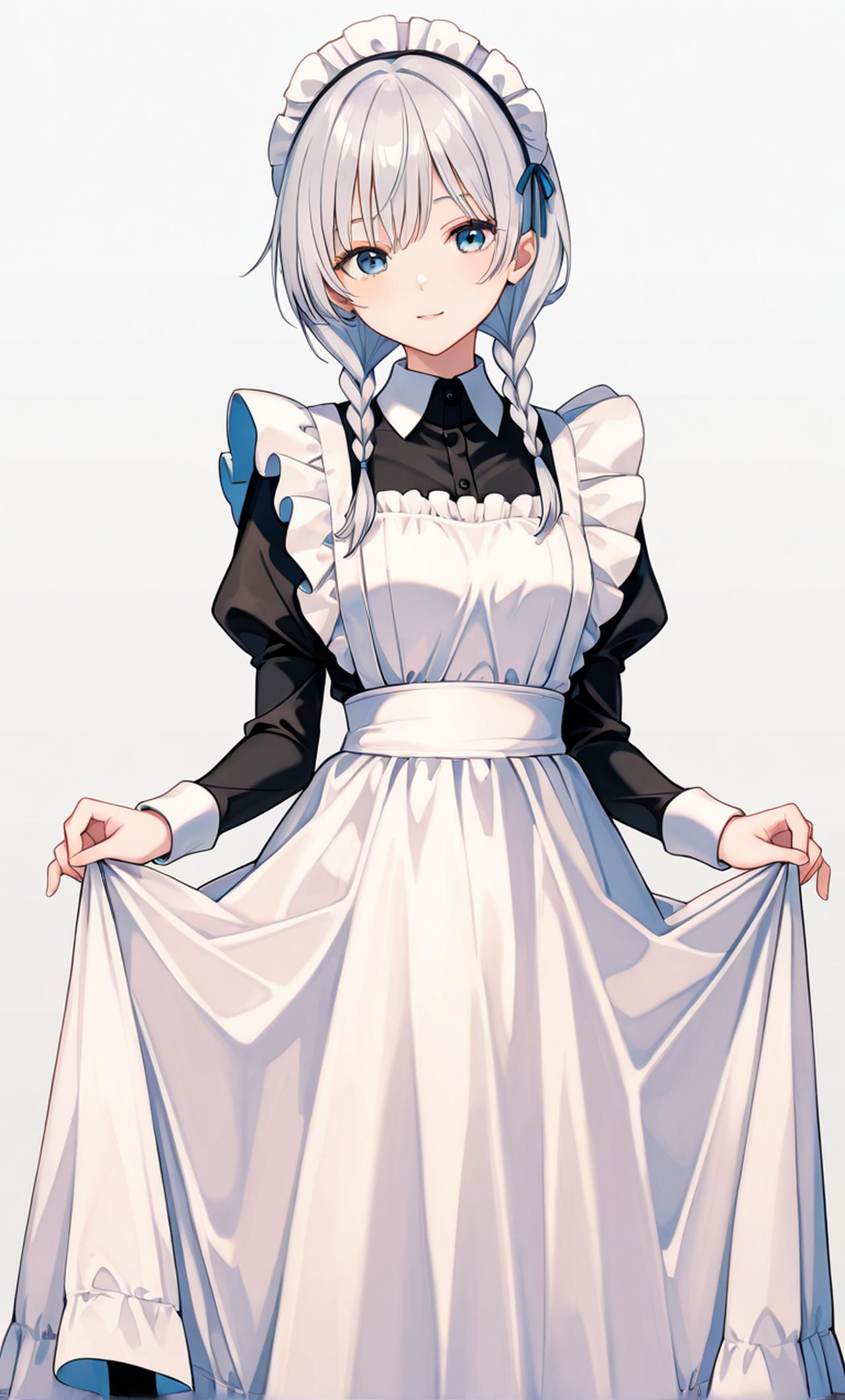 外貌特征:银色短发,两侧留有鬓角,扎成小麻花辫,末梢扎着绿色丝带。瞳孔颜色在不同作品中有所不同,可能为红色、茶色或蓝色。常穿着蓝白色调的女仆装,头戴女仆发卡。
