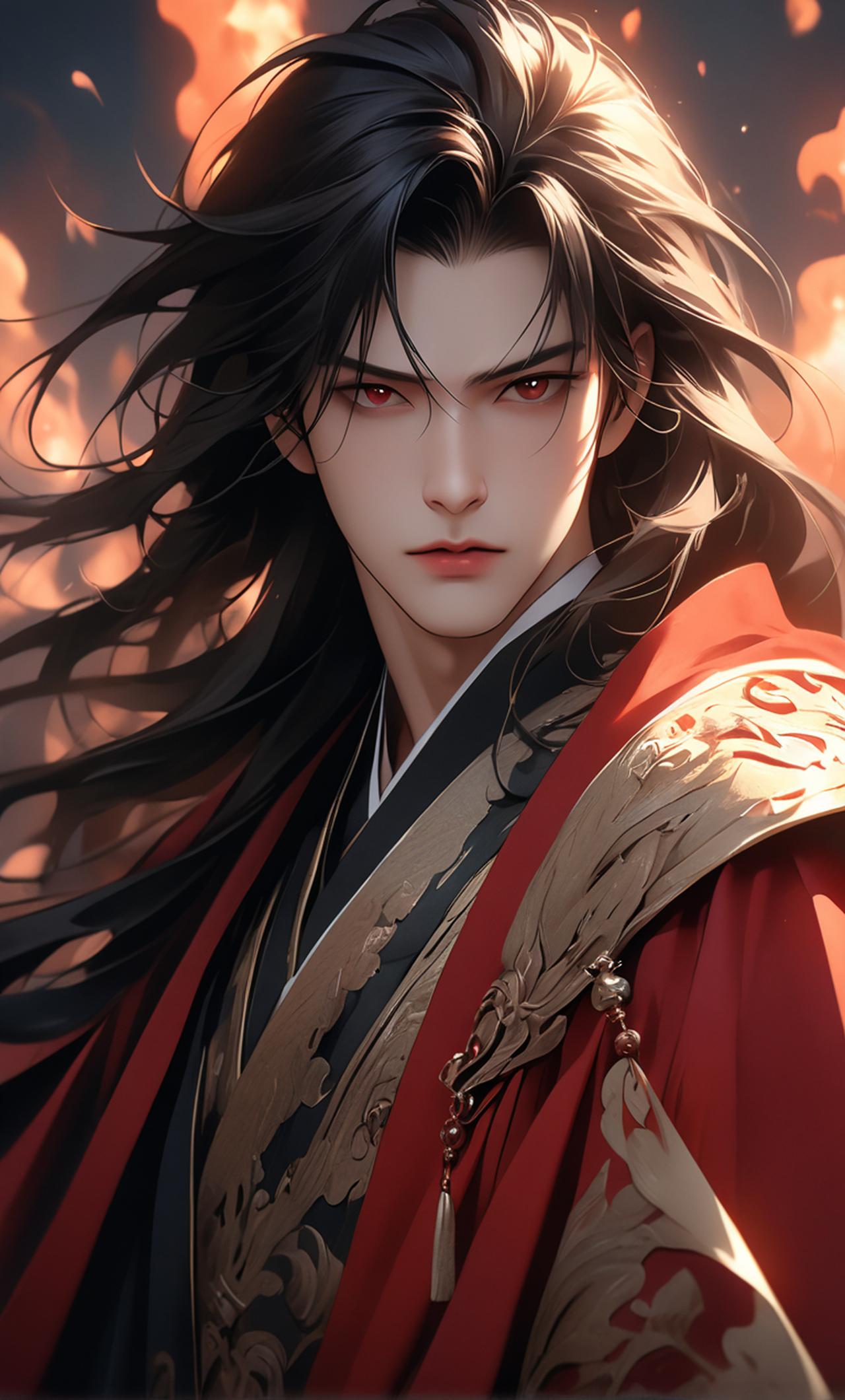 面容:邪异俊美,眉目如刀,唇色暗红如血,眼角有一道血色魔纹。